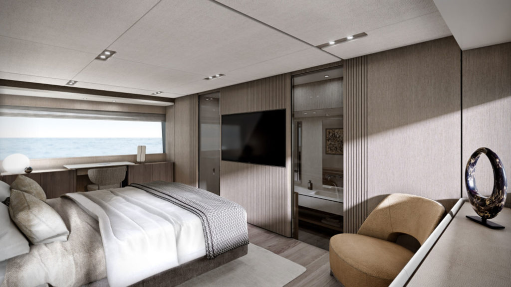 Il design degli interni risulta elegante e moderno pur rispettando la tradizione. La versatilità degli interni si traduce in un layout modulare che lascia all’armatore ampia scelta di interpretare la propria esperienza di vita a bordo. Il rapporto con l’ambiente circostante è valorizzato dalle grandi vetrate a tutta altezza che enfatizzano il contatto con il mare filtrando tanta luce naturale, i mobili freestanding, il legno (declinato in varie essenze e che è il materiale preponderante), rivestimenti pregiati e tessuti completano la dotazione di bordo e sono contrastati da marmi e cristalli. Come anticipato, lo studio Ideaeitalia offre la possibilità di scegliere tra due mood di interior: uno classico, dai toni morbidi, tradizionali e dai contrasti leggeri, e uno contemporaneo, ispirato a dettagli più urbani e moderni con colori decisi.