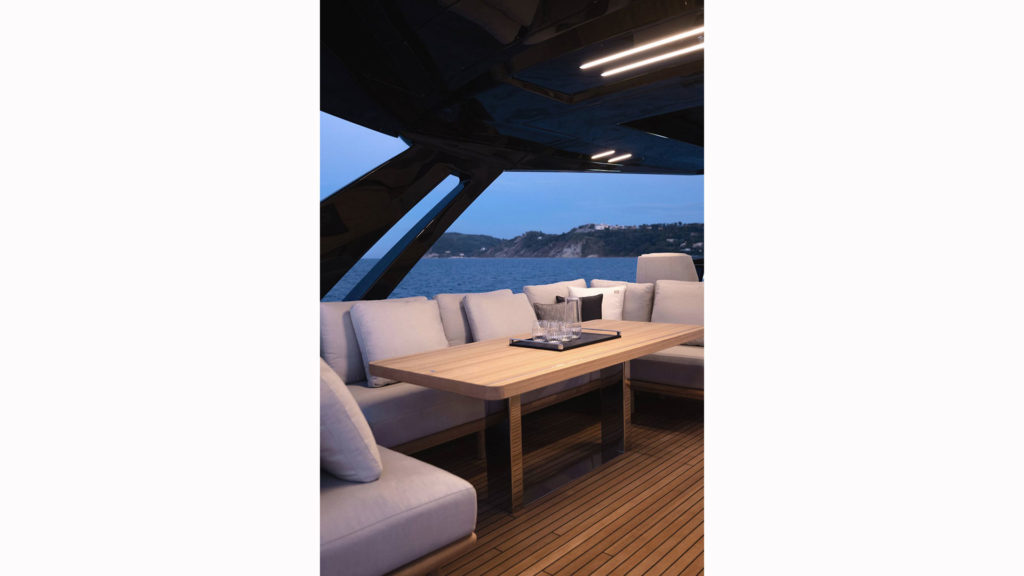 A poppa, sopra la spiaggetta – dove su richiesta può alloggiare un tender fino a 4.35m di lunghezza – scendono insieme o separatamente le due sezioni che formano il portellone e nella cui parte interna sono inseriti due sun pad, creando un’area conviviale a ridosso del mare. Nelle murate degli scalini di salita al pozzetto sono stati ricavati ampi storage, in grado di ospitare anche un Seabob. La zona esterna di prua è una lounge privata. È allestita con un divano a U e un’area prendisole centrale.