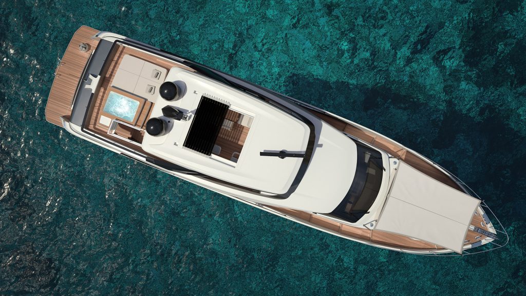Il pozzetto si presenta come un’area delimitata a poppa da un parapetto in cristallo e arredato con due divani contrapposti e ampio tavolo centrale. L’ingresso avviene da entrambi i lati alla beach area, da cui si accede al garage che può contenere due water toys, un tender di 3,95 mt e una moto d’acqua a due posti. Tra gli altri punti di forza: la possibilità di configurazione del flybridge con arredi freestanding che affiancano un mobile bar multifunzione, l’area dinette per 8 persone e una jacuzzi a poppa, su richiesta.