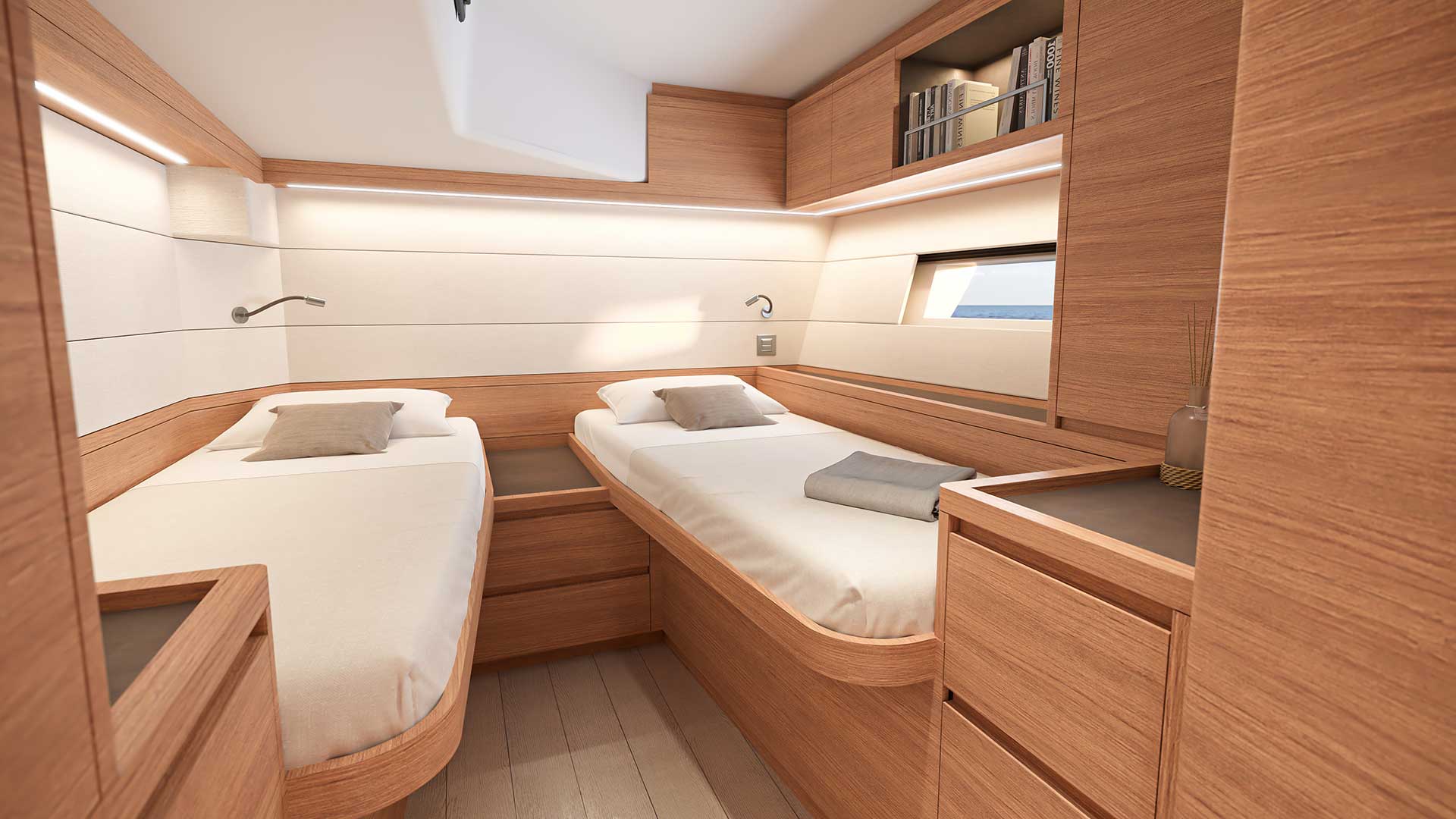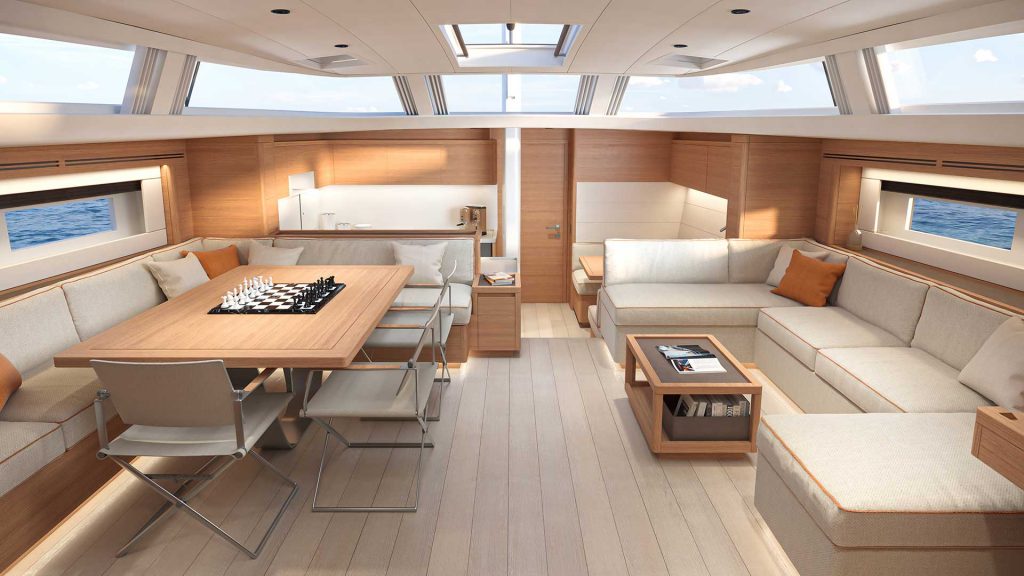 Sottocoperta, il Grand Soleil 65LC differisce leggermente rispetto alla versione Performance. Il salone, posto in posizione rialzata rispetto alle cabine per lasciare spazio alla sala macchine, ospita una sala relax ed un’area pranzo. Questa soluzione permette uno spazio maggiore nelle due cabine di poppa, più grandi per l’assenza del vano tecnico solitamente posizionato tra di esse. Questo layout ha inoltre permesso di realizzare una scala di dimensioni ridotte. Infine questa disposizione regala una vista a 270 gradi sull’esterno. Il Grand Soleil 65LC prevede la cucina a centro barca, creando così un unico open-space unito alla zona giorno. La versione Performance, caratterizzata dalla tuga filante e da un design più sportivo, presenta invece una cucina laterale spostata verso poppa così da ottimizzare lo spazio delle zone pranzo e relax. La sala macchine invece rispetta il tradizionale posizionamento dietro i motori.