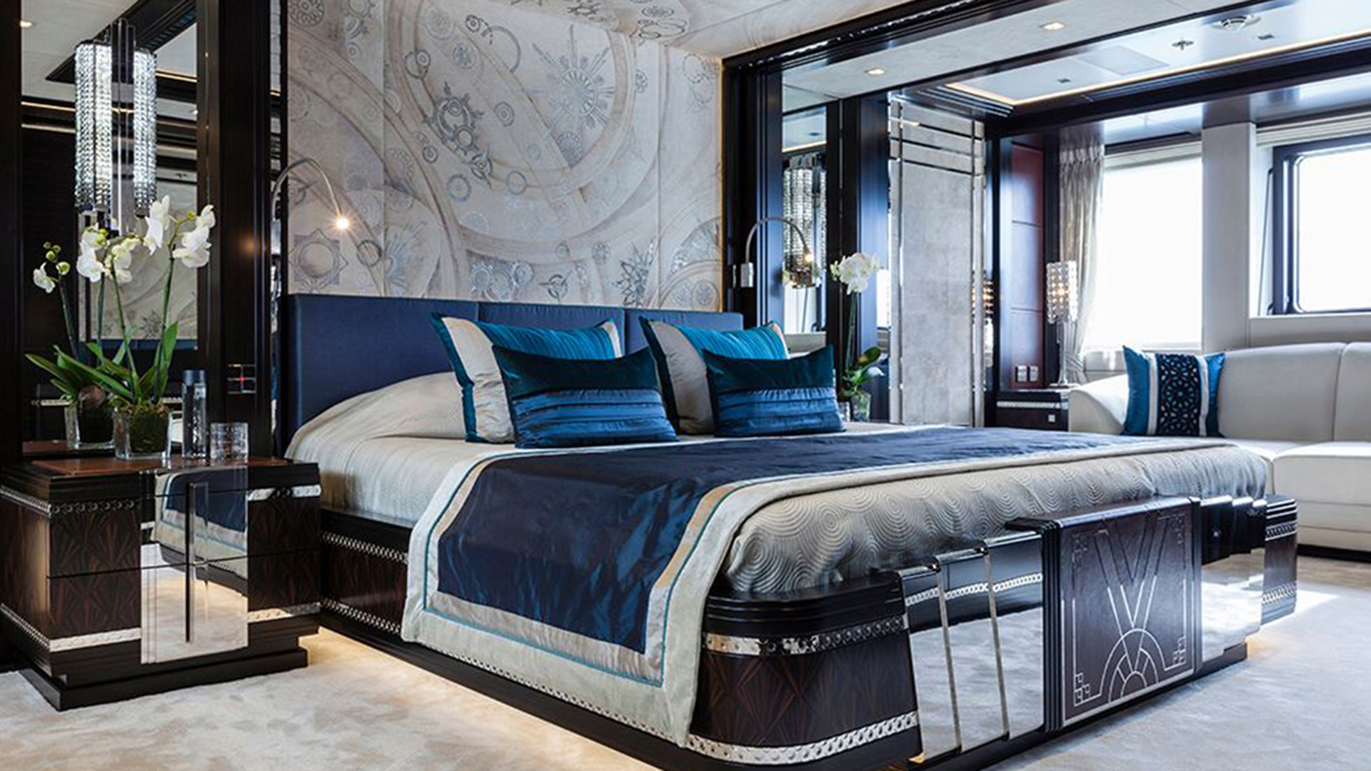 La master suite trova spazio sulla porzione anteriore del ponte principale e presenta degli interni curati esattamente come nelle altre stanze, aggiungendo però rispetto a queste ultime un ufficio privato, una camera da letto dedicata, un bagno e spogliatoi per lui e per lei. Il ponte di coperta mette in mostra un salotto informale con vista sull’Oceano, mentre quello inferiore ospita il beach club e le attrezzature per il tempo libero, tra cui palestra, bagno turco e bar.