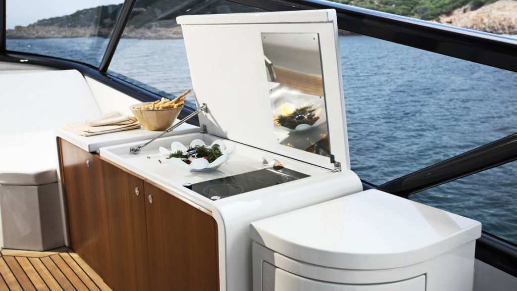Sottocoperta, gli interni sono vestiti da colori caldi e il layout standard conta 3 cabine: l’armatoriale full beam, una VIP a prua e una cabina ospiti con due letti affiancati a sinistra. La dinette presenta dimensioni notevoli e può ospitare anche un bar. L’imbarcazione è inoltre disponibile con il layout a 4 cabine, tutte con bagno en suite.