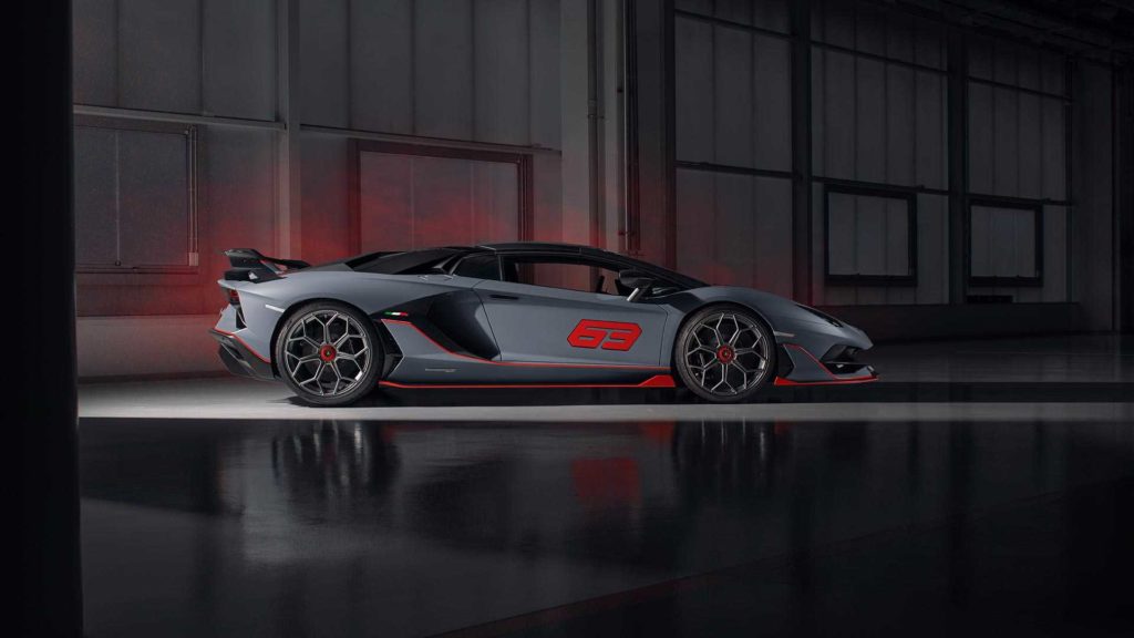 La vettura presente al Pebble Beach Concours d’Elegance 2019 è in Grigio Acheso opaco, abbinato a elementi esterni in fibra di carbonio a vista. Tra i dettagli in Arancio Dac spiccano i loghi SVJ e “63”, oltre al coprimozzo dei cerchi in titanio opaco. All’interno, i rivestimenti in Alcantara nelle tre tonalità Grigio Octans, Grigio Cronus e Arancio Dryope si abbinano a fibra di carbonio e CarbonSkin. I sedili sportivi in fibra di carbonio sono rifiniti con impunture incrociate Q-Citura bianche, mentre il logo “63” dietro ai sedili in fibra di carbonio e Alcantara laserata ricorda tutta l’esclusività della SVJ Roadster.