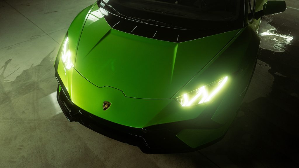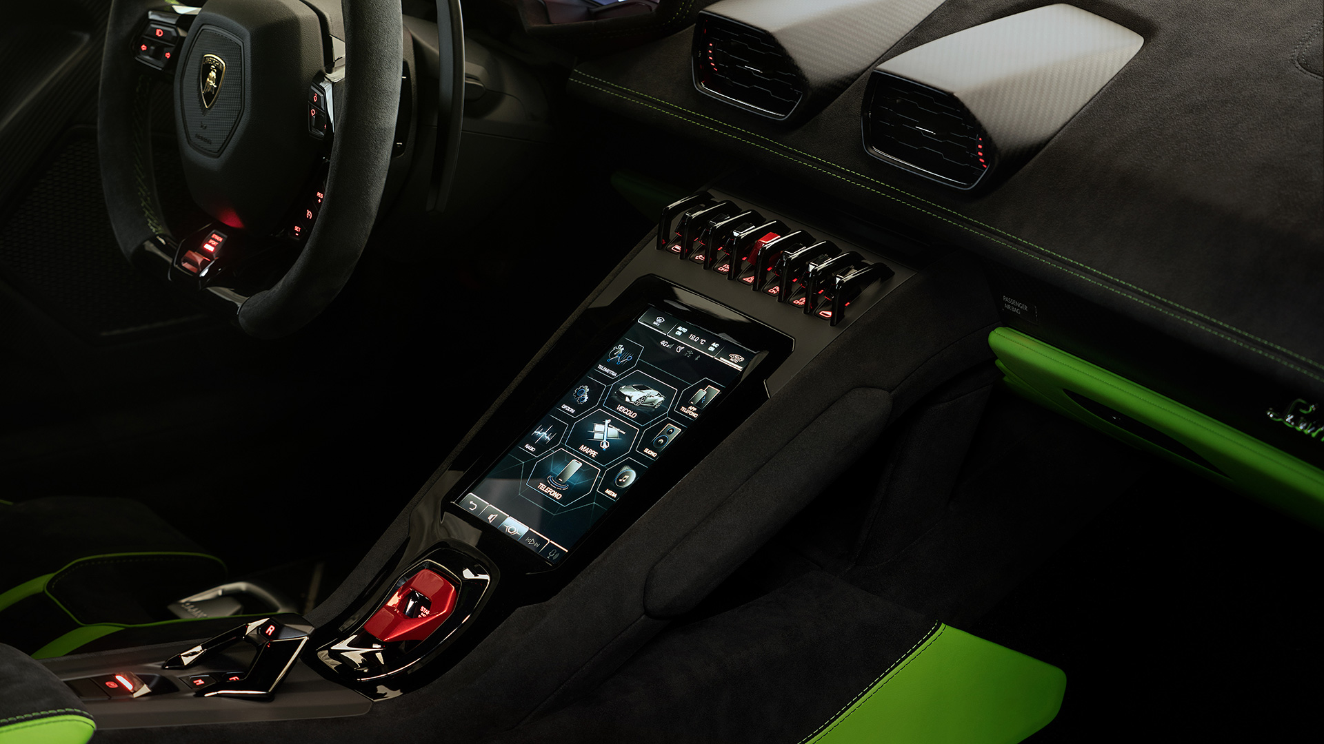 Anche il profilo della vettura la distingue dal resto della famiglia Huracán grazie a 6,1 cm di lunghezza in più e con una silhouette ispirata alle linee dei cristalli in stile Daylight Opening della Essenza SCV12. Il nero del motivo frontale a Y continua sui fianchi fino alle prese d’aria laterali, mentre il tetto, nello stesso colore della carrozzeria, è disponibile come opzione anche in nero. Nuovo anche il design della parte posteriore. Le sue linee rimodellate includono un nuovo lunotto posteriore verticale, mentre il cofano motore riprogettato e in fibra di carbonio leggera mette in mostra il cuore V10 della Tecnica. La sezione integra un nuovo paraurti con presa d’aria ottimizzata e un diffusore in tinta con la carrozzeria o, come optional, in nero; il tutto coniugato con nuovi terminali di scarico esagonali.