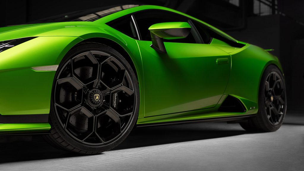 L’alettone posteriore fisso completa il profilo unico di Tecnica, mentre il suo design aerodinamico contribuisce in modo sostanziale a migliorare del 35% la deportanza posteriore rispetto a Huracán EVO RWD senza aumentare la resistenza aerodinamica, che anzi risulta ridotta del 20%, con un miglioramento dell’equilibrio aerodinamico, maggiore stabilità in frenata e più velocità in curva. Anche il sottoscocca di Tecnica è stato ottimizzato grazie a nuovi deflettori aerodinamici che ne accrescono l’efficienza aerodinamica. I nuovi cerchi Damiso, con taglio a diamante da 20’’, ispirati alla Lamborghini Vision GT, presentano un design esagonale e montano pneumatici Bridgestone Potenza Sport. All’interno troviamo i sedili sportivi ad altezza regolabile. Le opzioni disponibili includono porte coni fibra di carbonio, bulloni delle ruote in titanio leggero e apposite cinture di sicurezza a 4 punti per chi utilizza la vettura prevalentemente in pista.