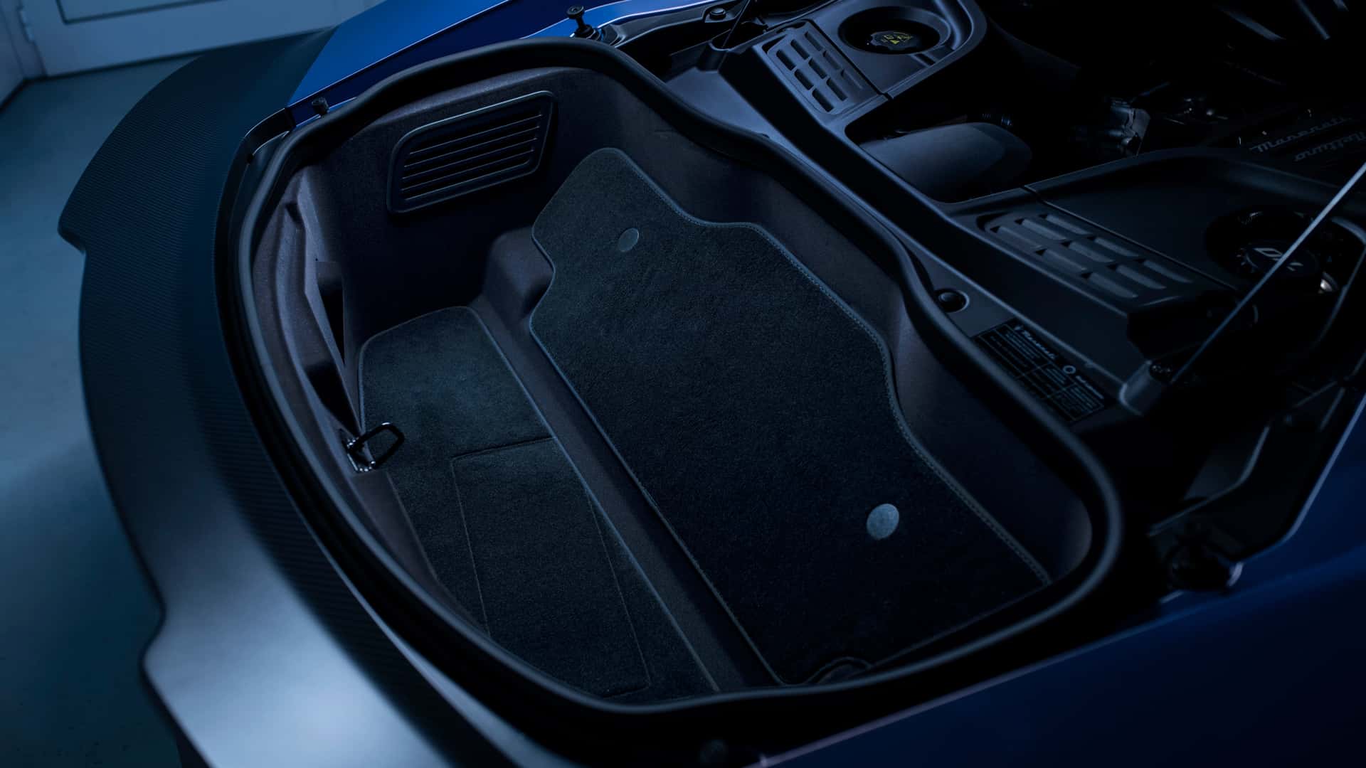 Le prese d’aria sono ora maggiorate e il ricorso alla fibra di carbonio è stato abbondante, ed è impiegato anche per ala posteriore e flap anteriori. Chi lo desidera può avere in CFRP anche tetto, fasce, estrattori alle spalle dei passaruote e minigonne laterali. L’interno, sebbene sportivo, preserva attenzione anche al comfort. Certo, rispetto alla “normale” MC20 qua troviamo più fibra di carbonio a vista, ma anche molta Alcantara e numerose superfici opache. Il volante è più spesso rispetto alla MC20 ma con meno comandi integrati: tutto è posizionato in modo da essere ergonomico, incluso il display centrale da 10.25”. Di serie troviamo anche l’impianto stereo a sei altoparlanti. Opzionale quello a 12 vie.