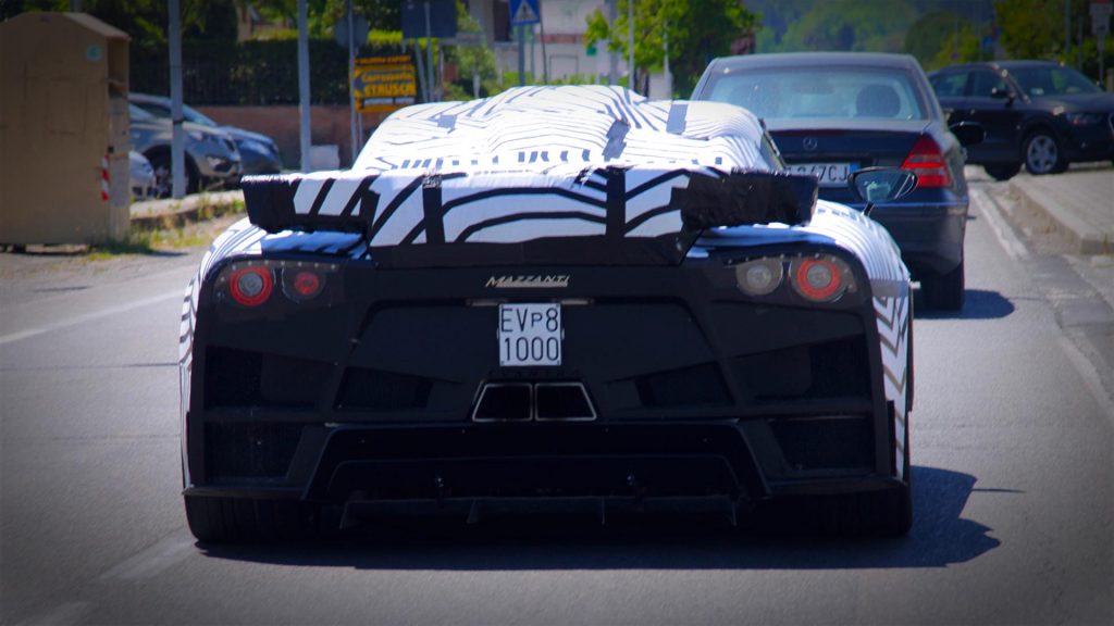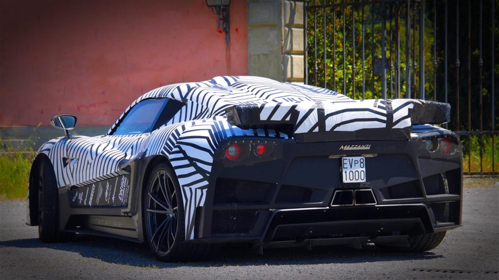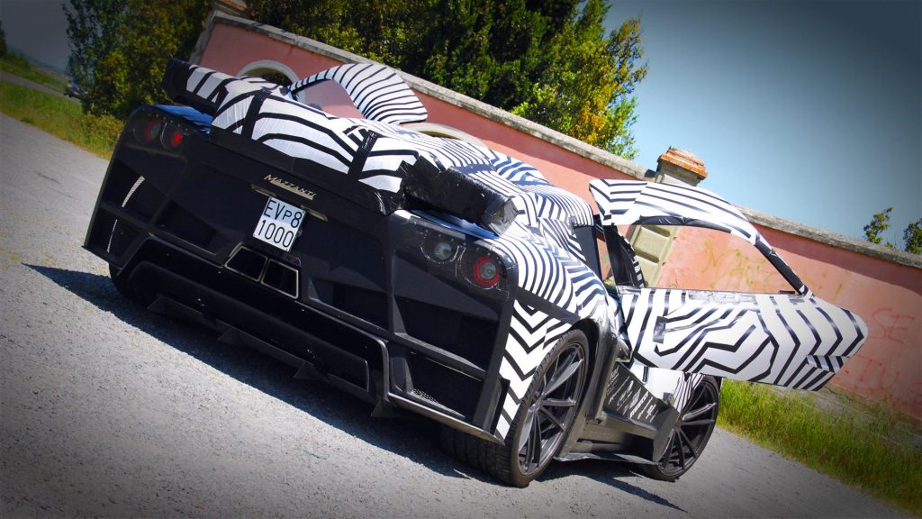 Le sue forme sono celate dalle mimetiche prototipali (allo scopo di non lasciar identificare all’occhio umano le soluzioni aerodinamiche in fase di collaudo), ma la vettura si fa immediatamente riconoscere come una Evantra. Passo corto, volumi rastremati, linee morbide ma che sanno di moderno, gruppi ottici minimalistici e muscoli prepotenti sapientemente di smoking vestiti. Esteticamente la Mazzanti è così: una vettura che non lascia spazio a compromessi. Ma che la si ami o che la si odi, una cosa è certa: non può essere minimamente confusa, nemmeno per errore, con nessun’altra hypercar in circolazione. E proprio questa è l’autentica forza della V8 di Pontedera: la sua marcata identità. Il suo stile unico. Il suo modo di essere. La capacità di coniugare forme classiche e moderne in un solo abito fatto di linee sinuose, di LED sottilissimi che ne connotano lo sguardo, di prese d’aria di grandi dimensioni apposte praticamente ovunque e di un ¾ posteriore che trasuda forza bruta da qualsiasi angolazione. Un generoso profilo alare volto a sovrastare un mastodontico estrattore caratterizza infatti la sezione di coda della vettura, integrando inoltre al proprio interno un impianto di scarico (qui a due vie) di forma squadrata e che richiama alla memoria più il sistema di uscita dei gas di uno stealth-fighter che quello di un’autovettura. Specchietti retrovisori minimalistici ma dalla conformazione filante, cerchi a razze sottili griffati OZ Racing e superfici trasparenti laterali dalle forme filanti completano la caratterizzazione estetica della Mazzanti Evantra, che in versione Prototipo guadagna un fascino racing difficilmente descrittibile. Tutte le soluzioni adottate sono minimalistiche e unicamente pensate per massimizzare la prestazione in fase di sviluppo, facendo insomma quel che solo un’auto da corsa saprebbe normalmente fare: trasmettere un senso di essenzialità performante.