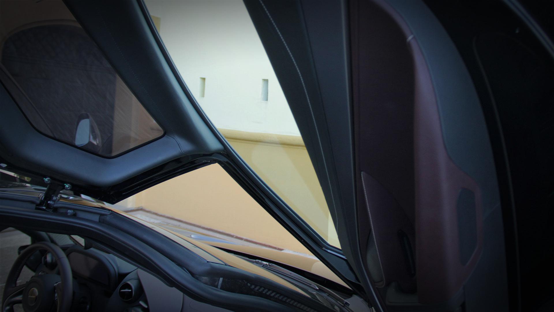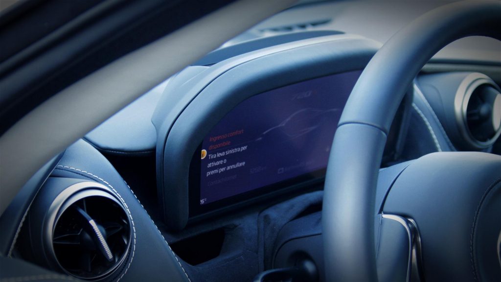 Un’aggressività demarcata da un propulsore che si retroillumina di rosso a vettura accesa e lasciato alla vista da una griglia sfociante in “branchie” e guide di flusso defluenti verso un profilo alare attivo che funge anche da aero-brake: nemmeno una nervatura insomma, su questa McLaren, è lasciata al caso. La 720S è un trionfo di personalità e di genialità. E questo concetto diviene ancor più evidente non appena si prende posto all’interno dell’abitacolo, passando al di sotto delle portiere ad apertura diedrale che scorrono all’insù. Un’ambiente che, come sulle Sports Series, rimane ordinato ed essenziale, ma che aggiunge qui una serie di soluzioni funzionali e stilistiche atte a confermarne l’evidente superiorità in termine di posizionamento di listino. Le pulsantiere e gli inserti metallici sono qui maggiormente presenti rispetto alle 570S [leggi la prova completa qui] e 570S Spider [leggi la prova completa qui] da noi provate, ed anche impunture di rivestimenti e sedili e conformazioni di plancia e tunnel centrale vanno a demarcare la maggiore ricercatezza estetica e tecnologica della 720S, insieme ad un volante maggiormente affusolato (e pregiato) e ad una strumentazione a scomparsa che, in un semplice clic, passa dal fornire qualsivoglia informazione al pilota a quelle minimamente indispensabili per la guida: una soluzione che rappresenta un vero e proprio fiore all’occhiello di quest’auto e mai vista su una vettura stradale, manifestando così in maniera immediata tutto l’heritage racing McLaren.