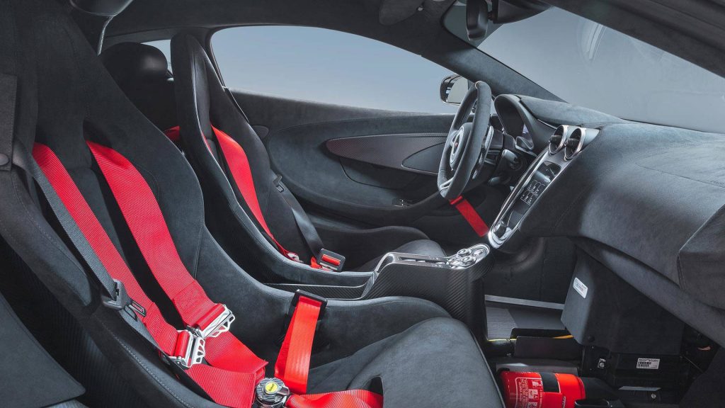 Impianto di scarico in titanio e inediti elementi in fibra di carbonio completano la dotazione della McLaren MSO X 570S, che mette in mostra al proprio interno un ambiente di marcata derivazione corsaiola e dominato da inedite sellerie con cinture a sei punti nonché da rivestimenti in Alcantara e da un tunnel centrale alleggerito allo scopo di contribuire nel contenimento delle masse.