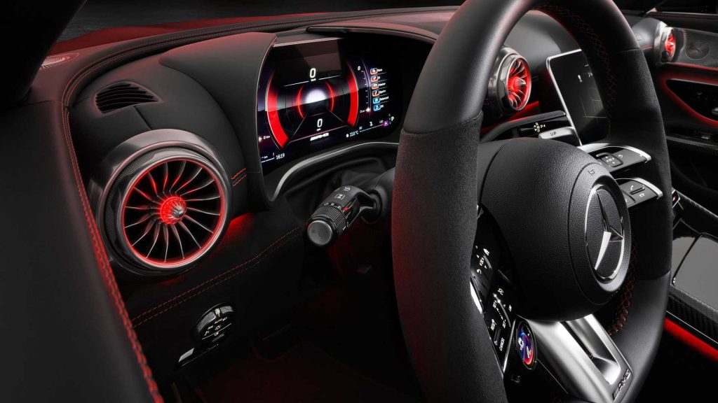 Aperta la portiera a farsi notare è un ambiente sportivo e tecnologico che mette in mostra rivestimenti in pelle, l’infotainment MBUX di ultima generazione (con schermo centrale da 11.9”), il quadro strumenti da 12.3” (affiancato da HUD con sistema a realtà aumentata). Di serie il sistema di riscaldamento del collo Airscarf (che sfrutta diffusori d’aria integrati nei poggiatesta anteriori) e il volante Performance AMG, nonché una serie di proposte per i sedili sportivi AMG regolabili elettricamente. Opzionali le sedute Performance AMG.