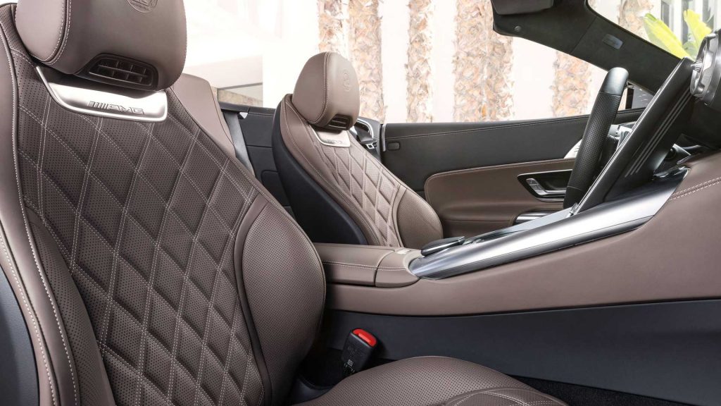 Dotata di maniglie portiera elettroniche a scomparsa (per ottimizzare il Cx) e della già menzionata capote in tessuto (che risparmiando peso abbassa anche il baricentro) in grado di ripiegarsi in 15 secondi e fino a una velocità di 50 km/h, la Mercedes-AMG SL presenta un estrattore maschio ai cui lati si stagliano le quattro uscite di scarico, oltre ad un profilo alare attivo integrato nel bagagliaio e regolabile su sei diversi livelli. Opzionale il pacchetto aerodinamico aggiuntivo che propone paraurti più “muscolosi”, appendici attive nel sottoscocca e un estrattore posteriore maggiorato.
