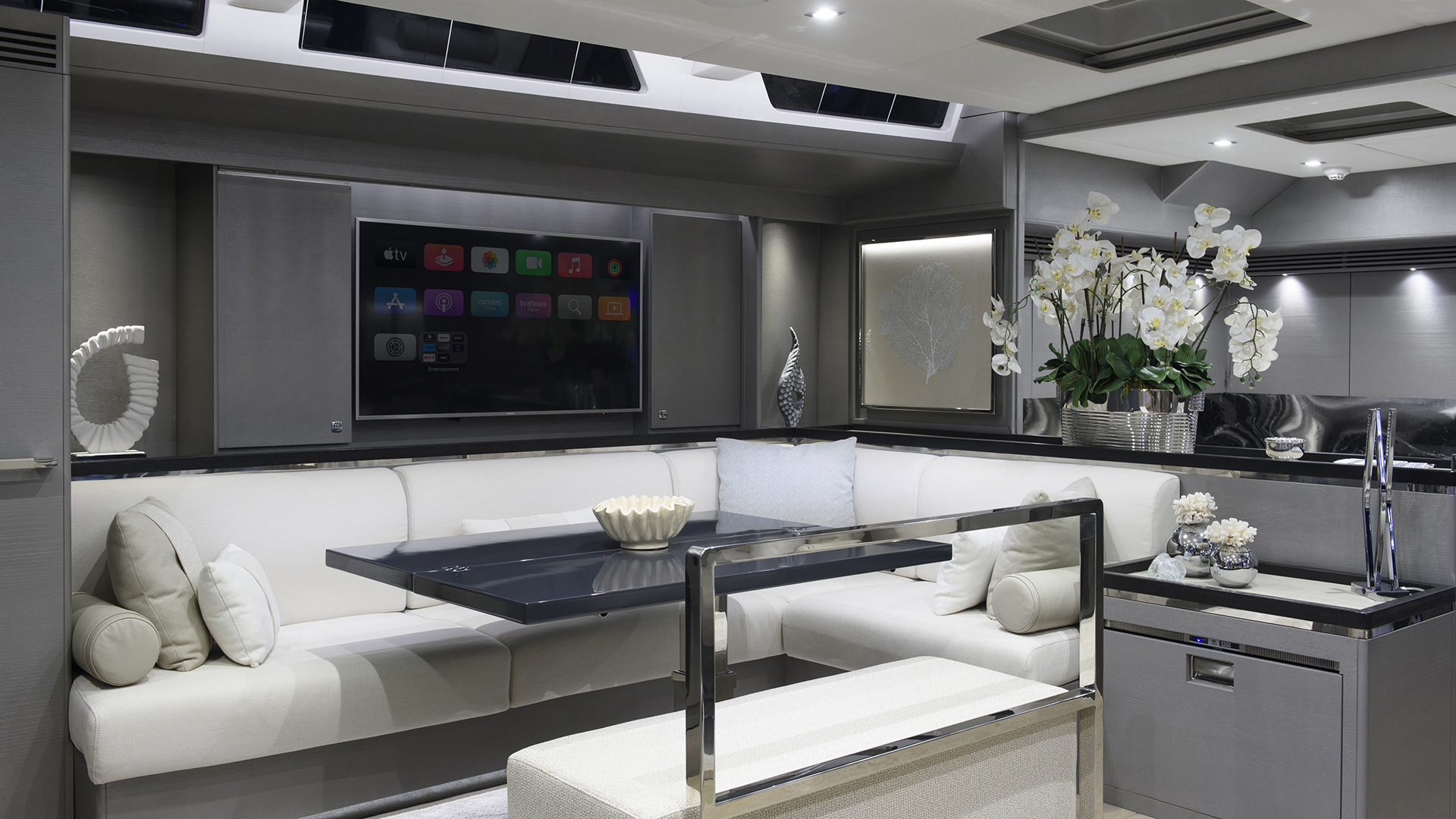 Un ampio corridoio porta ad un salone rialzato che offre posti a sedere per un gruppo di 12 o più ospiti. Qui trovano posto opere d’arte e due grandi televisori a schermo piatto, che possono essere nascosti da delle tendine. Si tratta di un’area inondata di luce naturale, grazie alle finestre sulla tuga e ai numerosi portelli soprastanti. A pochi gradini di distanza troviamo una cucina attrezzata, con frigorifero, congelatore ed elettrodomestici di alta qualità. Nella prima versione del Mishi 88, il salone è stato mantenuto aperto in modo che l’armatore possa preparare il cibo per la famiglia o per gli ospiti senza dover abbandonare la conversazione, ma chi lo desidera può richiuderlo. Questo spazio misura oltre 20 metri quadrati.