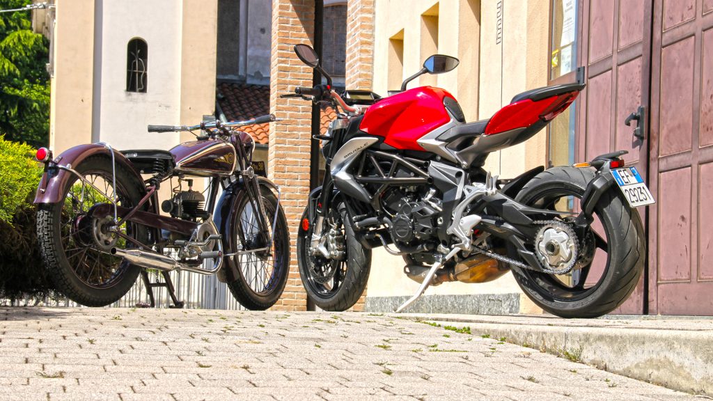 Riprendendo un prototipo del 1943, un monociclindrico 2 tempi da 98 cc a due velocità, il marchio Agusta realizza così un motociclo con telaio rigido sulla ruota posteriore, il quale venne poi presentato alla stampa nel novembre del 1945 e al grande pubblico – in Piazza Cordusio a Milano – in occasione della Vigilia di Natale dello stesso anno: la “Vespa 98” (gentilmente messaci a disposizione su strada dagli uomini del Museo Agusta accanto alla nuova Brutale 800 nel corso del nostro test ride lungo i luoghi della tradizione del marchio), che entrò in commercio a partire dalla primavera del 1946. A metà dello stesso anno debutta la versione a 3 marce della stessa moto, che viene rinominata semplicemente “MV 98” a causa della proprietà del nome di un’altra icona italiana, ovvero il marchio “Vespa”.