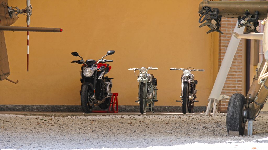 E questa storia è esposta proprio qui, intorno a noi. Parcheggiamo la MV Agusta Brutale 800 M.Y. 2016 oggetto del nostro test ride al di fuori del Museo Agusta dunque, ci togliamo giacca e casco, ed entriamo a scoprire nel dettaglio un passato di moto, elicotteri e personaggi divenuto leggendario. Dal debutto sul mercato della 98 la produzione MV Agusta dell’epoca è stata infatti quanto mai variegata, dando alla luce moto, scooter e motocarri: si va dai 50 cc fino ai 750 cc per un totale stimato di ben oltre 235.000 esemplari realizzati. Un numero incredibile per quel periodo storico.
