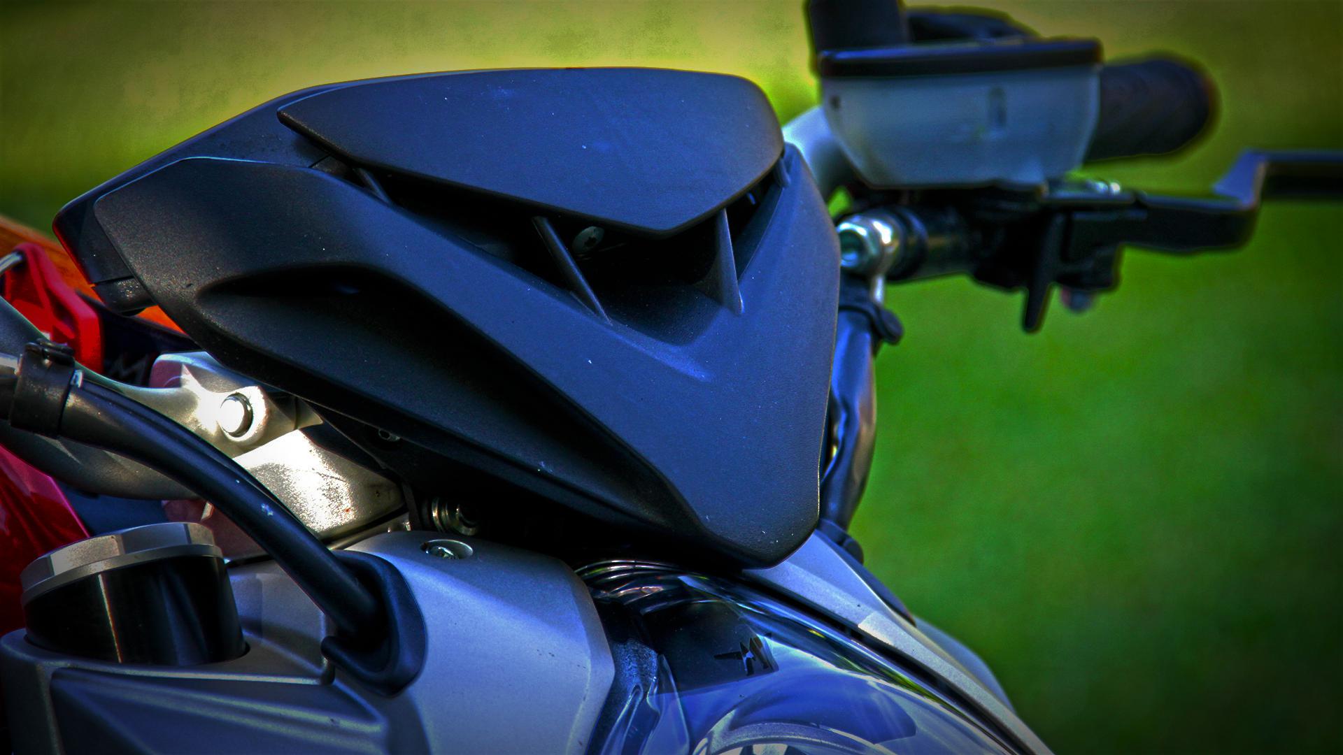 Ferma sul cavalletto la nuova MV Agusta Brutale 800 appare più come un’opera d’arte che come una motocicletta: linee tese e arrotondate sono sapientemente amalgamate a forme tonde e fluide omogeneamente riunite all’interno di un corpo minuto ma con muscoli ben definiti. Quasi niente di nuovo insomma sotto questo punto di vista: bella era e bella rimane. Le forme originariamente concepite da Massimo Tamburini 15 anni fa sono state con maestria reinterpretate ed attualizzate allo scopo di dare alla luce una moto che non ci si stancherebbe mai di guardare: la coda è divenuta ancora più corta e leggera (merito anche delle superfici cave generate dal telaietto reggisella) e i convogliatori d’aria – come anche gruppo ottico anteriore e cupolino – più affilati. Risultato? Ancora oggi, come nel 2001, parcheggiata di fianco a qualsiasi altra moto dello stesso segmento la Brutale la fa praticamente svanire: una magia resa possibile evolvendo, senza snaturare, forme e volumi che sono divenuti stilemi. Una “firma” questa che da sempre caratterizza le due ruote della Meccanica Verghera.