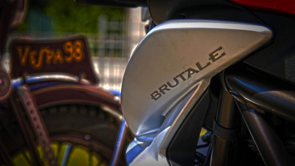 Costeggiamo il tratto finale della pista di volo dello stabilimento AgustaWestland di Vergiate (ove la moto continua a sentire il profumo della propria tradizione) con gli elicotteri che ci decollano affianco e con la Brutale che ci accompagna verso il Lago di Varese nel corso di una danza che non ci stancheremmo mai di effettuare mentre di tanto in tanto l’occhio scorre anche verso la minimalistica (per dimensioni) strumentazione digitale, la quale mette, in maniera chiara e ben leggibile (si deve fare uno sforzo in più solo per monitorare le spie di servizio, che trovano posto nella porzione inferiore del quadro), a disposizione del pilota pressoché tutti i dati necessari relativi alla moto (eccezion fatta per l’indicatore del livello della benzina). E mentre lo sguardo si alza inizia a comparire dinnanzi a noi la segnaletica stradale che, come una Stella Polare, ci indica la via di casa della due ruote gentilmente concessaci in prestito. Ultimi km da godersi appieno quindi in sella ad una moto che non vorremmo smettere mai di utilizzare. Agilità nei cambi di direzione, sportività intrinseca e motore dalla personalità elevata ne fanno una perfetta compagna d’avventure per gite domenicali e viaggetti fuoriporta che non vogliono dimenticarsi di concedere (lunghi) istanti di puro divertimento prima di fermarsi a prendere un gelato da qualche parte per soffermarsi a rimirarne le affascinanti forme (è una delle poche moto che non stonerebbero affatto anche in salotto: tant’è che per riprova noi l’abbiamo addirittura piazzata in una boutique di alta moda). Un’opera d’arte in movimento questa Brutale, che per nostra sfortuna dobbiamo accingerci a restituire nelle mani dei legittimi proprietari: sulla linea del nostro orizzonte inizia infatti a palesarsi lo specchio d’acqua in apertura citato nel quale si va a riflettere lo stabilimento di Schiranna, ove tutte le MV Agusta di epoca moderna (ovvero dalla prima F4 in poi) hanno visto e vedono tutt’ora la luce. Un luogo che respira a sua volta sapore di aeronautica da tutte le parti: gli stabili in cui l’azienda ha ora sede sono infatti stati di proprietà Aermacchi (marchio che trova ora base a Venegono Superiore, ovvero sempre nel varesotto e a pochissimi km da qui) prima e di AMF-Harley Davidson poi (come testimonia l’MB 326 arancione presente all’interno dello stabilimento del Gruppo Cagiva).