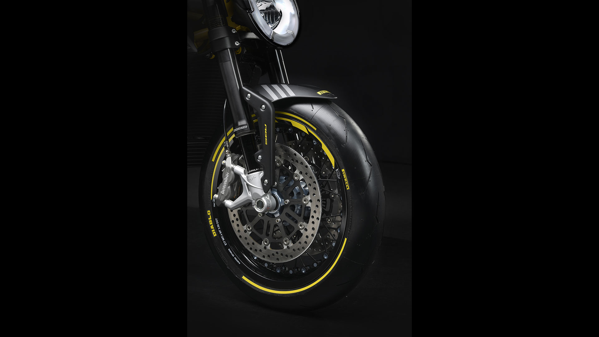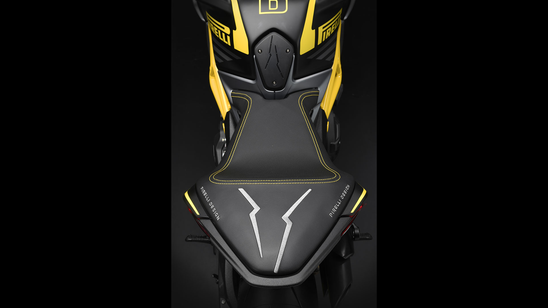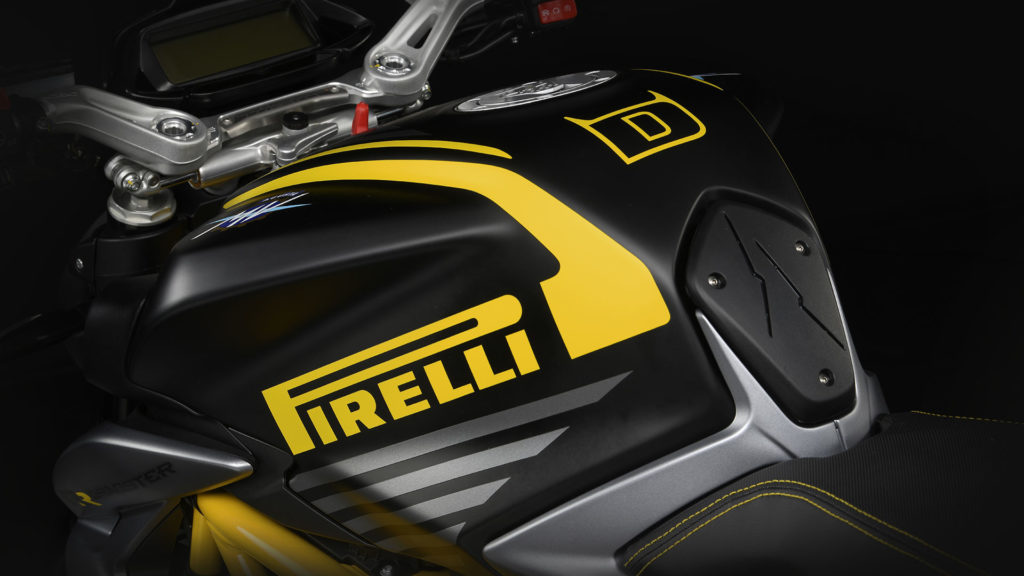 Doppia texture con impunture a contrasto e per il “flash” distintivo del logo Diablo (ricamato) impreziosiscono il codino firmato Pirelli Design e completano la caratterizzazione estetica della MV Agusta Dragster 800 RR Pirelli, che aggiunge a quanto elencato anche una finitura specifica dei terminali di scarico (ottenuta attraverso l’applicazione di una speciale vernice a base ceramica) e una grafica dedicata per i pneumatici opzionali Diablo Supercorsa SP.