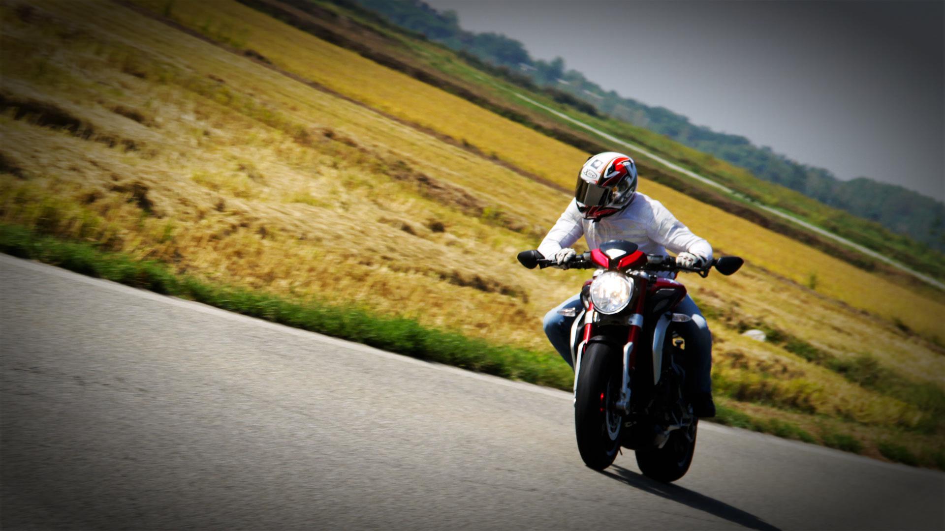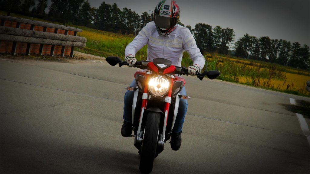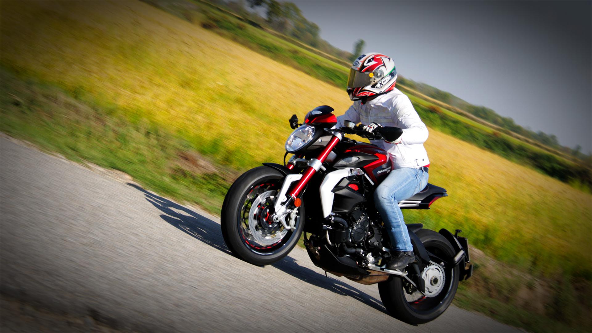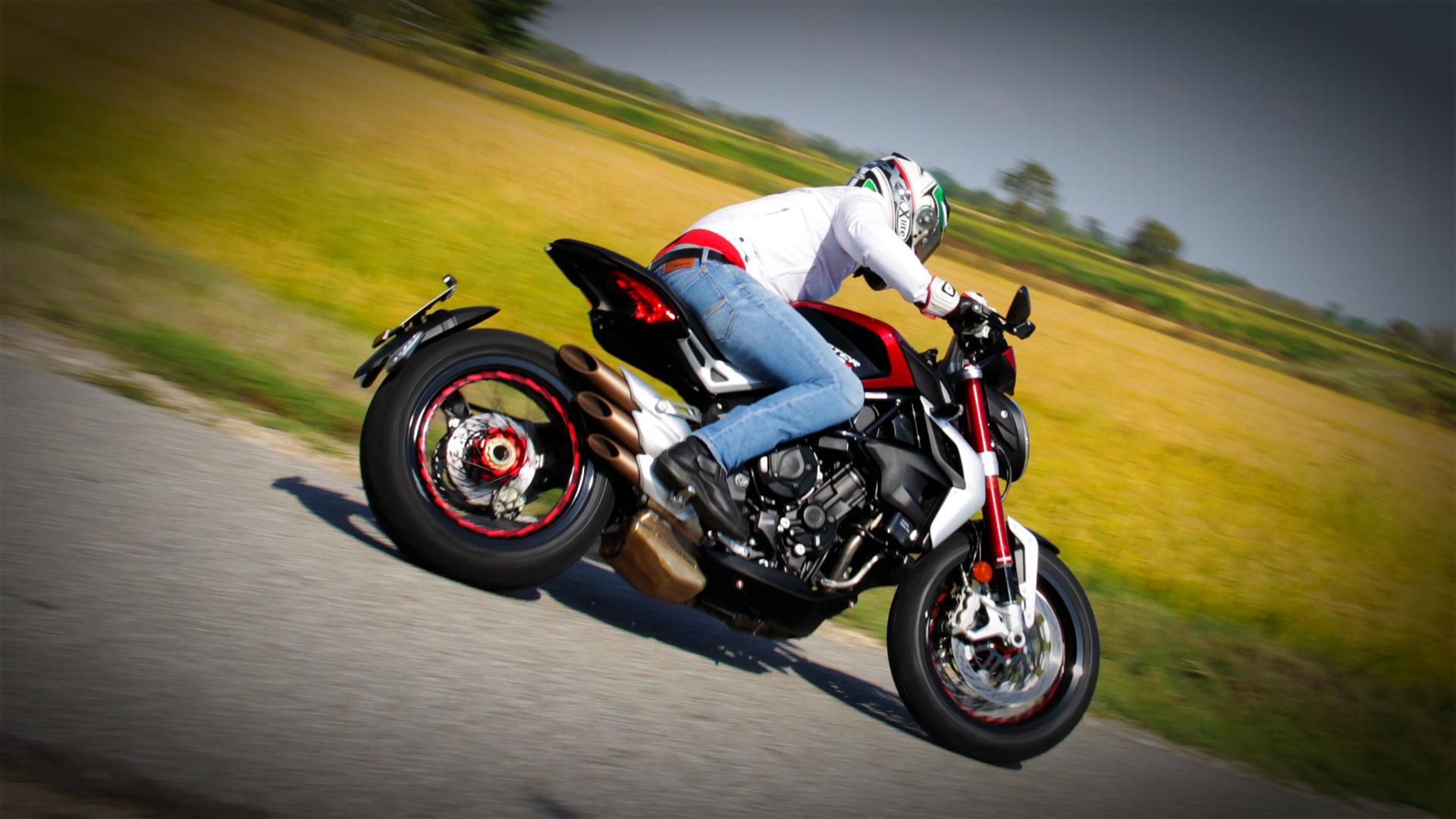 Preso posto in sella alla MV Agusta Dragster 800 RR ci si sente quasi dei giganti: si percepisce in maniera demarcata di trovarsi al di sopra di una moto particolarmente minuta. Tutto è rastremato al minimo essenziale e l’impostazione di guida – come precedentemente anticipato – è protesa in avanti, caricata, chiusa e di chiara estrazione sportiva. La strumentazione è essenziale e minimalistica, ma ciò nonostante mette a disposizione del pilota tutte le informazioni a lui necessarie, sia per la guida che per interfacciarsi con la gestione elettronica e che si va a retro-illuminare di arancione non appena girata la chiave, prendendo così “magicamente” vita e restituendo d’un colpo al guidatore tutto l’elevato carico tecnologico contenuto all’interno della moto. Un giro di chiave, prima dentro, frizione rilasciata (potremo infatti da qui in poi praticamente dimenticarci di tale componente grazie all’ausilio del cambio elettronico – molto preciso negli innesti e piacevolissimo da utilizzare – che ci permette di variare rapporto, senza di essa, sia a salire che a scendere) e iniziamo a puntare la ruota anteriore in direzione delle Colline Novaresi e delle campagne che circondano il territorio nel quale ci troviamo a muoverci nel corso di questa prova. Iniziamo a questo punto a prendere confidenza con una moto che si dimostra profondamente evoluta rispetto alle MV del passato: l’erogazione è morbida e progressiva. L’on-off è scomparso praticamente del tutto e la gestione ride-by-wire funziona in maniera impeccabile, permettendo così al pilota di entrare immediatamente in sintonia con una moto ora divenuta più fruibile e meno rabbiosa in termini di erogazione. Il che non significa che i muscoli sono scomparsi: tutt’altro. Nerboruta era e nerboruta rimane: la MV Agusta Dragster 800 RR si conferma una body-builder “intrappolata” in un corpo nettamente più minuto rispetto al suo strabordante carattere, ma i cui “muscoli” possono essere ora mossi con maggior grazia ed armonia rispetto ai “movimenti più scoordinati” del passato, traducendosi così in pose più “plastiche” ed eleganti. In cosa si traduce questo nella guida di una due ruote? Si traduce in una gestione del motore direttamente nel polso destro del rider e nel far seguire alla moto esattamente le intenzioni dello stesso: il carattere scorbutico e indomabile delle prime versioni è stato lasciato alle spalle della Dragster 800 RR per giungere ora a noi forte di una maturità concreta e affermata: la piccola naked varesina con animo maxi è ora più guidabile e gestibile in curva grazie ad una fluidità divenuta esemplare.