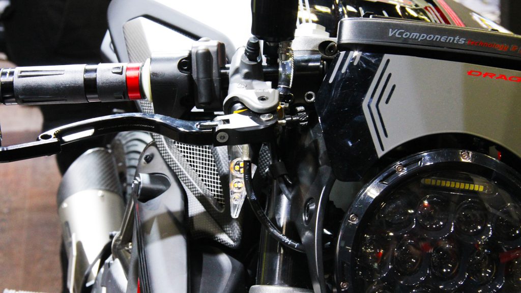Pressoché infinite le componenti speciali presenti sulla MV Agusta Dragster BlackOut by Valter Moto: si va dagli immancabili inserti in fibra di carbonio alle leve snodate, passando per sella con impunture a vista, per i cerchi a raggi di derivazione Dragster 800 RR, per i tamponi di protezione del telaio e per lo scarico SC-Project. Il tutto senza dimenticare le pedane griffate MV Agusta Corse, delle originalissime frecce minimalistiche a sezione triangolare, degli inediti faretti e un gruppo ottico anteriore a LED di stampo minimalistico sovrastato da una cover strumentazione caratterizzata dalle tre tonalità a contrasto che adornano tutta la moto, ovvero nero, grigio e rosso.