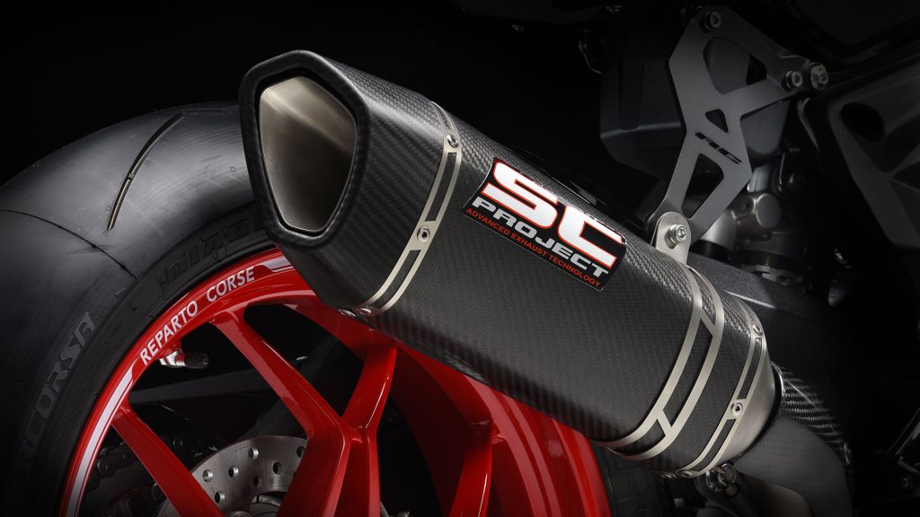 L’impianto di scarico in titanio, con silenziatore e tubo di raccordo, è fornito da SC Project ed è completato dalla protezione paratacco in fibra di carbonio e dalle staffe in alluminio di supporto del silenziatore stesso. La centralina con mappa dedicata allo scarico è inclusa nel kit, come il copricodino monoposto, le leve freno e frizione in ergal, il cavalletto posteriore e il telo coprimoto. Ogni RC è inoltre identificata dal certificato di origine, che ne attesta l’unicità.