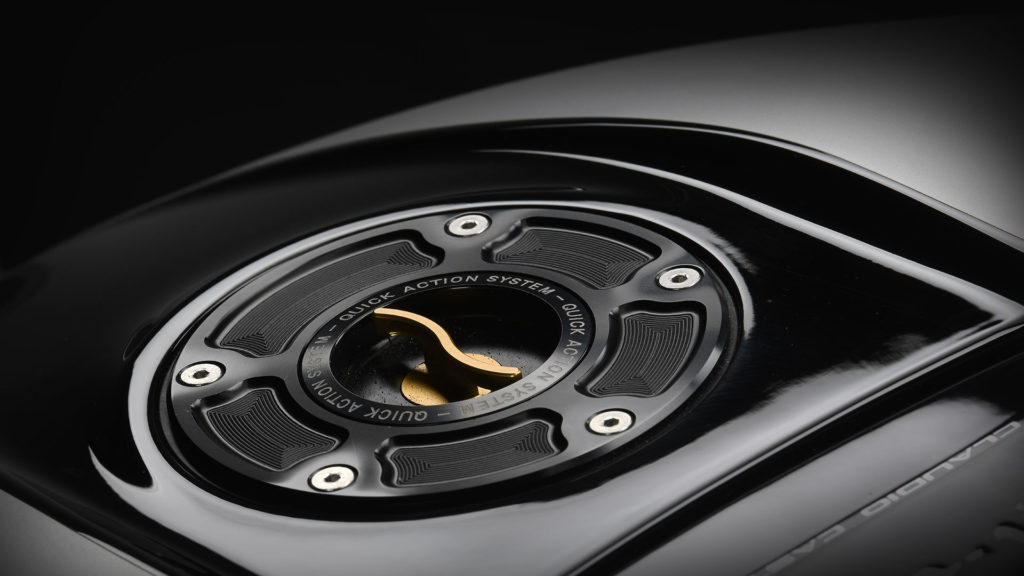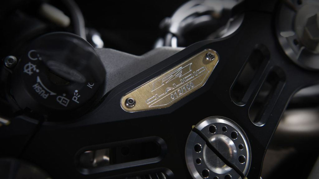 Il titanio è stato utilizzato per i terminali dell’impianto di scarico SC- Project, forniti a corredo con il kit racing, e che riporta sui silenziatori il logo Claudio applicato tramite laser; altra particolarità è la lavorazione CNC del fondello posteriore. Spazio al titanio anche per la viteria, mentre le leghe di alluminio lavorate alle macchine utensili a controllo numerico prendono il sopravvento per quanto riguarda componenti funzionali come la piastra superiore di sterzo, ampiamente alleggerita; le pedane pilota regolabili in altezza; il dado della ruota posteriore, montato a sbalzo sul monobraccio; le leve di freno e frizione, le pulsantiere racing, i tappi dei serbatoi del fluido idraulico destinato all’impianto frenante e alla frizione e il tappo del carburante. A suggellare l’esclusività della F4 Claudio contribuisce la sella del pilota, che si caratterizza per la lavorazione trapuntata, con il logo Claudio ricamato.