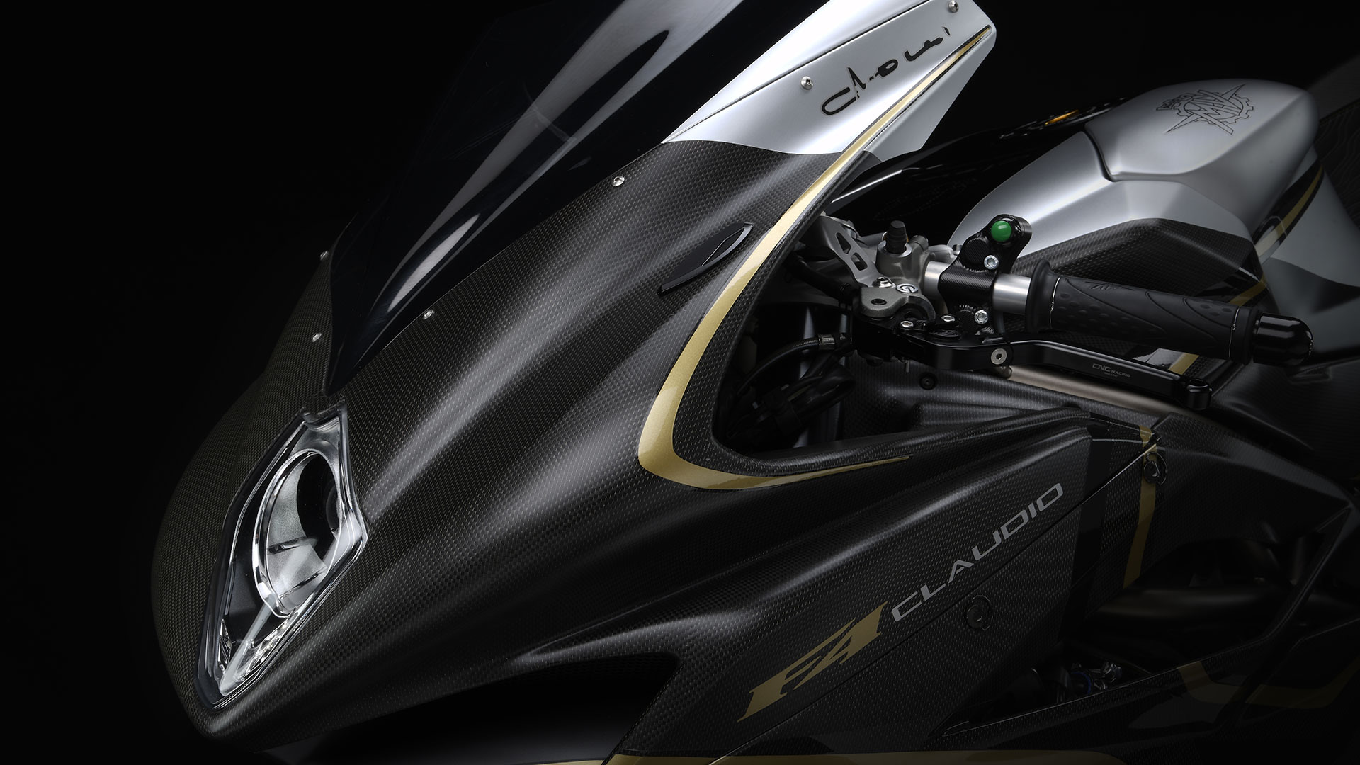 Tantissimi i ‘materiali nobili’: la MV Agusta F4 Claudio impiega in maniera estesa il titanio, la fibra di carbonio e le leghe leggere. L’intera carenatura è realizzata in CFRP e la trama, specificamente disegnata, vede l’alternanza di aree con finitura lucida ad altre con finitura opaca. Il design è esaltato da un filo dorato, costituito da rame rivestito tramite trattamento anodico. Il cupolino, le fiancate, il puntale e il copricodino monoposto sono in fibra di carbonio, al pari dei cerchi BST Rapid Teck.