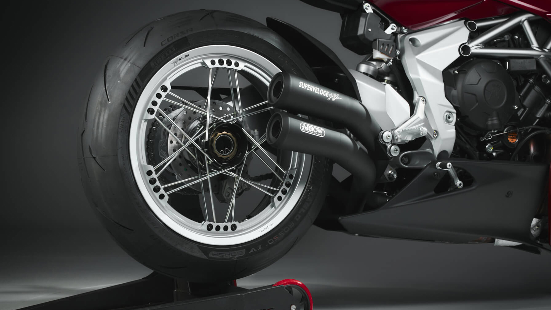 Connotata da una colorazione bordeaux che riprende quella della MV 98 e denominata “Rosso Verghera”: una tonalità frutto di diverse sperimentazioni eseguite presso il CRC e realizzata specificamente per questa moto. Oltre a questo speciale cromatismo “spezzato” da elementi grafici dedicati, la MV Agusta Superveloce 98 Edizione Limitata porta in dote un Ride by Wire aggiornato, un impianto frenante ottimizzato, gli pneumatici Pirelli Diablo Rosso IV Corsa, i cerchi a raggi da 17” e, con il kit racing, anche l’impianto di scarico Arrow (per il solo impiego in pista), la cover della sella del passeggero, la centralina sportiva e il telo coprimoto, nonché ovviamente il certificato di autenticità.