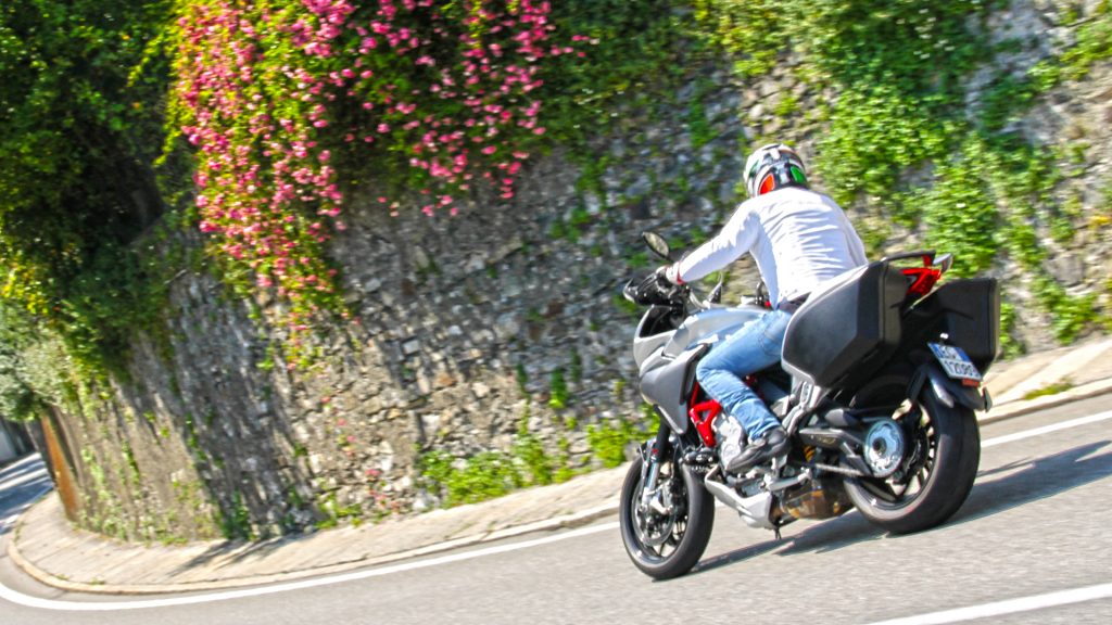 L’inequivocabile sonorità del propulsore tricilindrico di Schiranna e un ride-by-wire ben messo a punto, che funziona con lo stesso rigore e precisione del cambio elettronico EAS 2.0, coinvolgono i nostri sensi al punto di non farci praticamente rendere conto di essere già arrivati a Stresa (location nota, tra le altre cose, per le Settimane Musicali di Stresa e del Lago Maggiore, nate nel 1961 per volontà di Italo Trentinaglia de Daverio, un nobile avvocato veneziano che fu spinto all’amore della musica dal padre Erardo, già organizzatore musicale e Direttore Generale del Teatro alla Scala di Milano), da dove inizieremo la salita verso la cima del Mottarone, una montagna granitica la cui vetta si erge a 1.492 metri sul livello del mare (che separa il Lago Maggiore dal Lago d’Orta) e vera e propria meta di peregrinaggio per i motociclisti della zona. I curvoni veloci e scorrevoli del lungolago cedono qui il posto al misto stretto e guidato, pertanto anche i 110 CV della mappa Sport impiegati in precedenza lasciano spazio ai 90 messi a disposizione dalla Touring che meglio si adattano al percorso che ci apprestiamo ad affrontare. Un percorso più tortuoso, con tornanti, “esse” in contropendenza e curve impegnative che si raccordano tra loro: nulla di meglio per divertirsi un po’ in compagnia della MV Agusta Turismo Veloce. Iniziamo a salire in quota facendo scorrere velocemente il panorama lacustre alle nostre spalle mentre la tourer varesina conferma in salita le ottime doti dinamiche già evidenziate in pianura e affermando con forza quella che è la sua più grande sorpresa, ovvero il fatto di essere probabilmente l’MV Agusta più audace mai costruita. Se infatti precisione direzionale, avantreno granitico e ottime capacità dinamiche fanno in buona sostanza – al pari dello stile – parte dei trademark MV, la vocazione turistica e la capacità di macinare km in scioltezza (magari anche al fianco delle borse da viaggio – da 30 litri di capienza l’una – e del navigatore Garmin proposti in via opzionale) rappresentano sostanzialmente una novità per una due ruote della Casa di Schiranna.