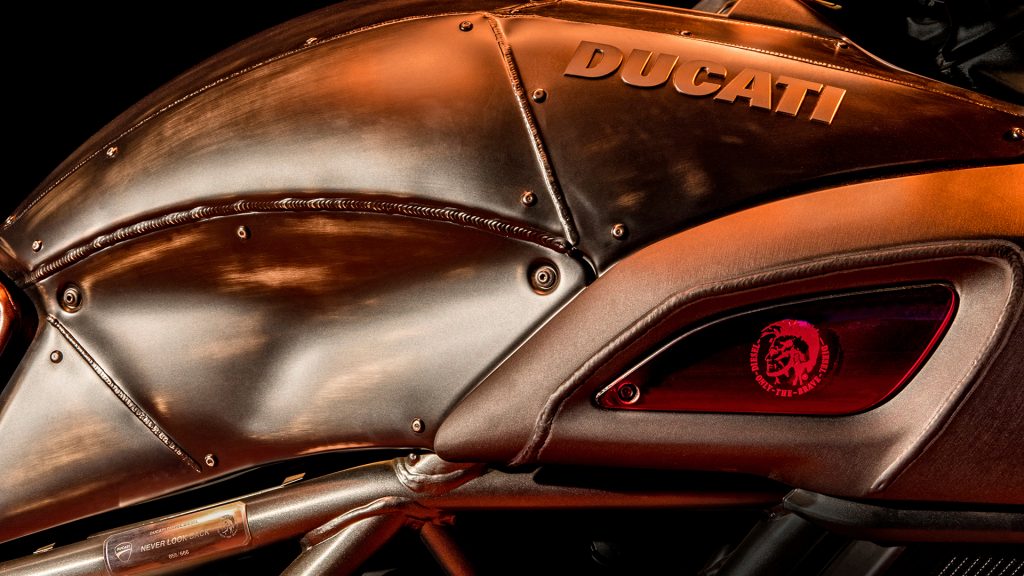 Per realizzare la nuova Ducati Diavel Diesel, i due centri stile si sono ispirati a un immaginario post-apocalittico e retro-futuristico, oltre che a un dinamismo ipercinetico. Il risultato di questa collaborazione è stato svelato a Milano, in occasione della settimana della moda maschile, nel corso di un evento che, grazie a un set up emozionale e alla componente musicale curata dai The Bloody Beetroots, ha ricreato l’ambiente ideale per l’unveiling della moto.