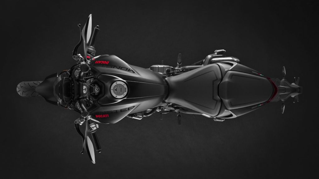 Ogni componente è stato riprogettato e alleggerito: i cerchi perdono 1,7 kg, il forcellone si alleggerisce di 1,6 kg. Il telaietto posteriore cala di 1,9 kg grazie anche alla tecnologia GFRP (Glass Fiber Reinforced Polymer) con cui è stato realizzato. Il risparmio di peso totale in ordine di marcia è di 18 kg rispetto al Monster 821. L’altezza da terra della sella è di 820 mm. Come accessorio è disponibile una sella che riduce l’altezza da terra a 800 mm. Per chi lo desiderasse, è acquistabile anche un kit per le sospensioni che abbassa ulteriormente l’altezza sella a 775 mm da terra.
