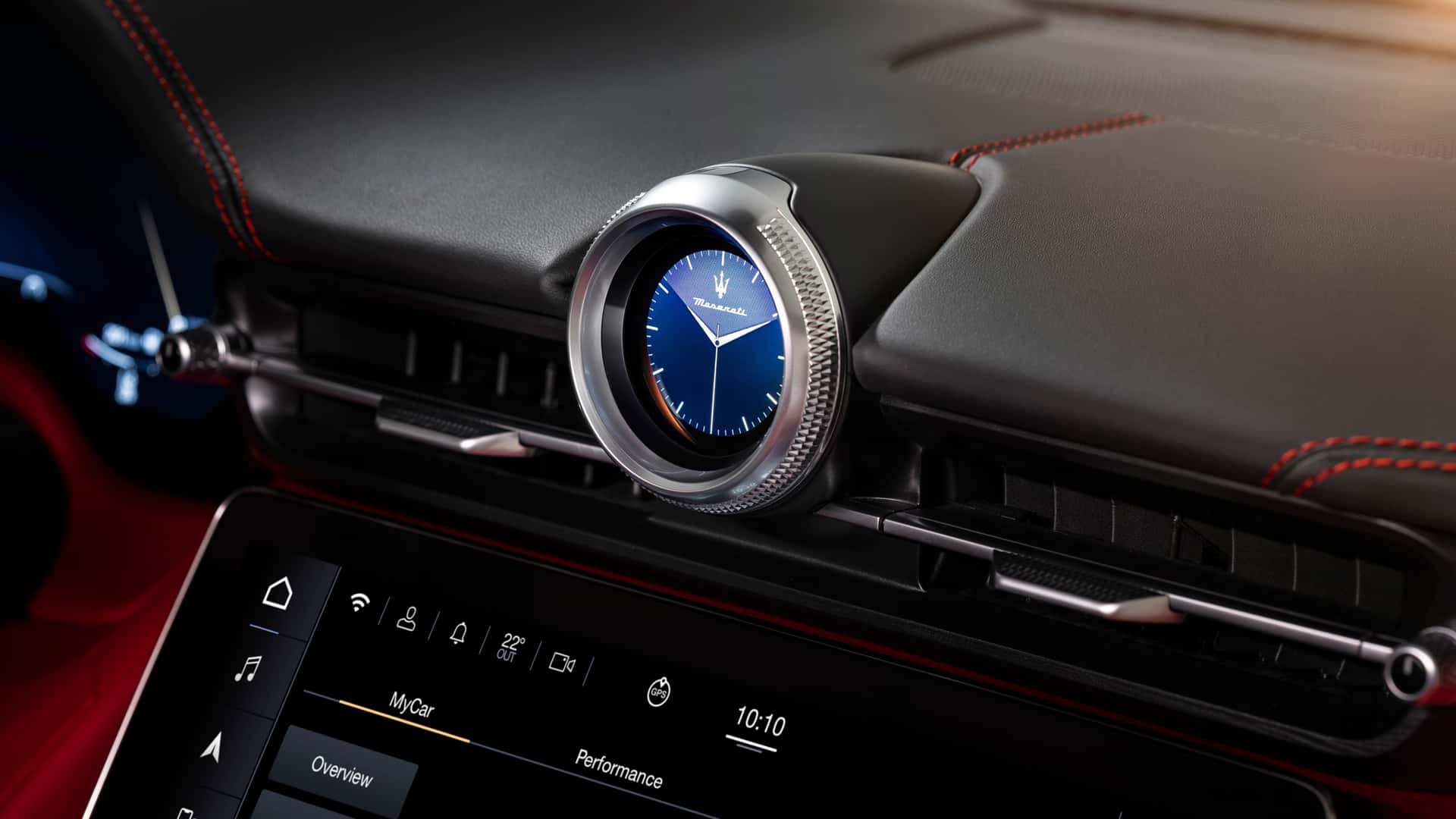 La movimentazione del tetto viene attivata dal touch-screen dell’infotainment mentre uno scaldacollo di serie garantisce il comfort climatico a tetto scoperto agli occupanti delle file anteriori e con regolazione a tre velocità. Opzionale il wind-shield installabile alle spalle dei sedili anteriori. Al centro della plancia troviamo, come sulla GranTurismo, un display da 12,3” che fa il paio ad un secondo schermo da 8,8” dedicato al clima e ad altre funzionalità, nonché alla strumentazione digitale da 12,2”. Di serie il Maserati Intelligent Assist con Android Auto e Apple CarPlay.