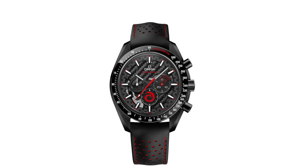 Pensato per omaggiare il catamarano TF35 del Team Alinghi l’Omega Speedmaster Moonwatch Dark Side of the Moon Alinghi presenta una finitura scura (proprio come l’imbarcazione da cui ne mutua il nome) e materiali di derivazione nautica sportiva. La cassa è in ceramica nera (sia lucida che satinata), mentre il quadrante è in fibra di carbonio (materiale usato per lo scafo del TF35).