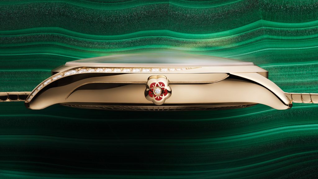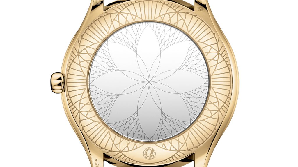 Per entrambi i nuovi orologi Trésor, le casse da 36 mm sono realizzate in oro 18 carati Moonshine, con l’aggiunta di 38 diamanti a taglio pieno, che si curvano elegantemente lungo i lati. Oltre a un singolo diamante posto nella corona, circondato da un fiore Omega in ceramica liquida rossa, il segnatempo presenta anche un fondello metallizzato con effetto specchiato.