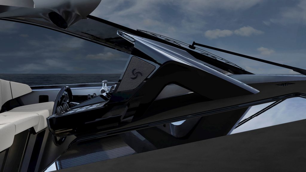 L’imbarcazione è frutto della collaborazione tra il Cantiere del Belpaese e Giuseppe Bagnardi dello studio BG Design Firm. La consolle di guida si ispira al mondo delle auto da competizione, con una struttura in fibra di carbonio che ricorda il sistema protettivo “halo” utilizzato dalle vetture di Formula 1 e da altre macchine da corsa. La stessa struttura dispone inoltre di un sistema di raffreddamento integrato ed indipendente per mantenere sempre l’elettronica della consolle a temperatura costante. Le prese d’aria sulla parte anteriore dello yacht e lo “snorkel” sull’hardtop ricordano il cofano e i condotti sul tetto delle auto più esclusive.