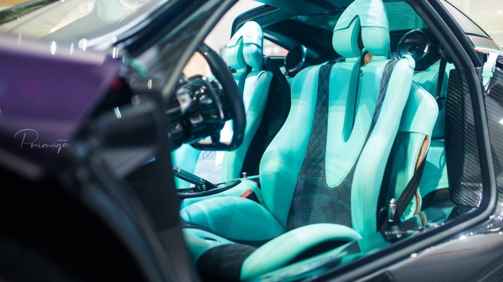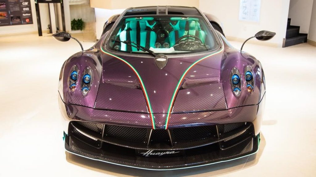 Caratterizzato da un corpo vettura in fibra di carbonio in color viola, l’esemplare in foto della Pagani Huayra Dinastia presenta dei cerchi da 21” al posteriore e da 20” all’anteriore rivestiti in oro – alle cui spalle lavorano degli ammortizzatori Öhlins appositamente sviluppati per questo modello – e una serie di elementi grafici distintivi dedicati.