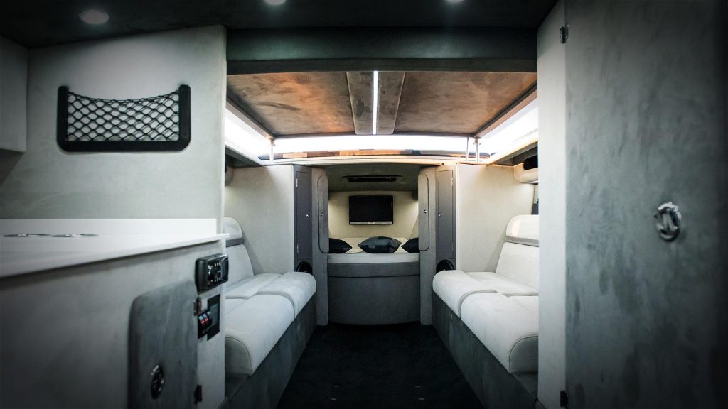 Caratterizzato da una serie di mimetiche prototipali, l’offshore è lì ad attenderci in acqua, mentre un gommone-transfer sta facendo rotta verso di noi per condurci verso lo stesso che ci trasporterà in mare aperto ad una velocità folle da lì a breve. L’emozione cresce in maniera esponenziale in noi mentre ci avviciniamo a questa spettacolare imbarcazione capace di ben 110 nodi di velocità massima grazie a due motori (preparati da corsa) da 1.250 CV di potenza ciascuno. La sua linea è filante, snella e aggressiva, nonché caratterizzata da una tuga rialzata per massimizzarne la visibilità in fase di attracco e ormeggio.