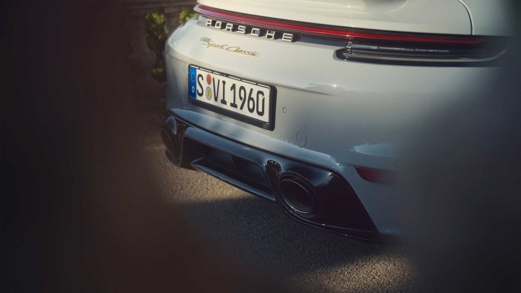 Come nel caso della prima generazione 997 della 911 Sport Classic lanciata nel 2009, i progettisti si sono ispirati alla verniciatura in tinta Fashion Grey della prima Porsche 356. In alternativa alla finitura Grigio Sport metallizzato, la nuova 911 Sport Classic è disponibile anche in Nero, Grigio Agata metallizzato, Blu Genziana metallizzato o Paint to Sample. Le strisce doppie in Grigio Sport le ritroviamo sul cofano, sul tetto e sullo spoiler posteriore.