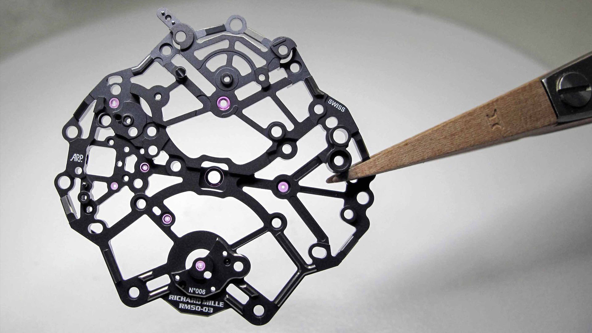 Forte di un peso contenuto entro soli 40 grammi, il Richard Mille RM 50-03 McLaren F1 dispone di componenti sia in titanio che in fibra di carbonio, oltre che in grafene (un materiale sei volte più leggero dell’acciaio ma ben 200 volte più resistente dello stesso): la cassa in Carbonio TPT è infatti stata realizzata facendo ampio ricorso a tale soluzione. È infatti costituita da 600 strati di filamenti paralleli (da 30 micron di spessore ciascuno) impregnati in una resina a sua volta pregna di grafene.