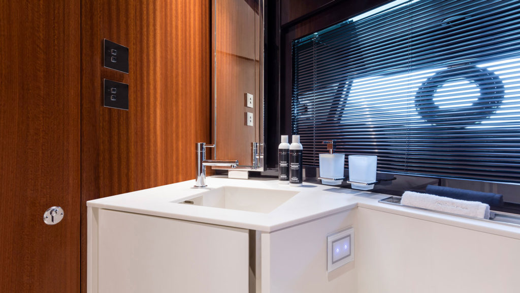 Un tambuccio in cristallo, oltre alle ampie finestrature a scafo, assicura all’ambiente la massima luminosità. Il bagno a giorno indipendente, in diretta comunicazione con la dinette, consente di sfruttare al meglio l’open per crociere giornaliere con vari ospiti, che possono utilizzare l’ambiente in totale privacy senza accedere alle cabine e ai bagni riservati a chi pernotta a bordo. La zona notte è allestita con tre cabine en suite, nelle quali si può ammirare lo stesso gioco materico e cromatico visto nella lounge, a cui si aggiunge il contrasto fra la pelle bianca dei testa letto e del fascione e la pelle scura nei pianali dei comodini e alla base dei letti. La cabina armatoriale è collocata a dritta, mentre a prua c’è una cabina VIP, entrambe con proprio bagno. Completa l’offerta una cabina doppia con due letti a castello servita da un bagno che funge anche da bagno a giorno. Essenze, laccati chiari e scuri, superfici specchiate e corian bianco sono gli elementi decorativi dei bagni. Su richiesta, la terza cabina per gli ospiti può essere sostituita da una cabina equipaggio.
