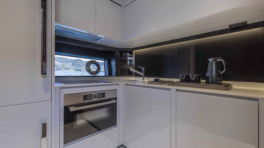 Anche il ponte inferiore è caratterizzato dall’ abbinamento di rovere sabbia e laccati chiari o scuri, intervallati da dettagli di cuoio nero, inclusa la possibilità di scegliere come alternativa principale il palissandro. Secondo il layout standard dell’imbarcazione, il lower deck accoglie gli ospiti in un salottino arredato con divano chiaro a L Gentili&Mosconi e, su richiesta, un pouf con tavolino basso. Di fronte al salottino, a dritta, si trova una cucina separata da una porta e attrezzata con tutti gli elettrodomestici – banco di lavoro, piano cottura e lavabo – disposti sulla murata e verso poppa.