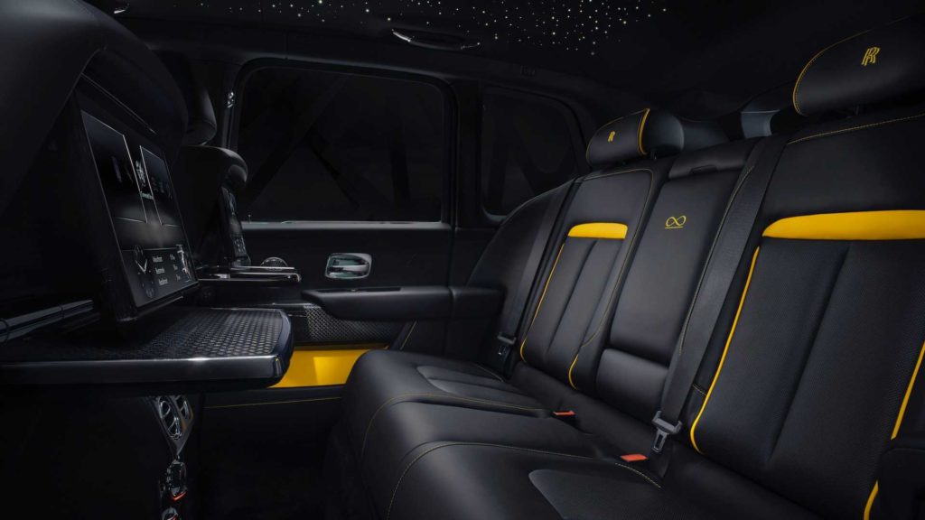 A “spezzare” il monocromatismo nero sono degli inserti gialli, che ritroviamo anche all’interno di un abitacolo a sua volta dominato da rivestimenti neri, da inserti in fibra di carbonio, di pellami Forged Yellow opzionali, da un cielo stellato e da tutta una serie di particolari distintivi.