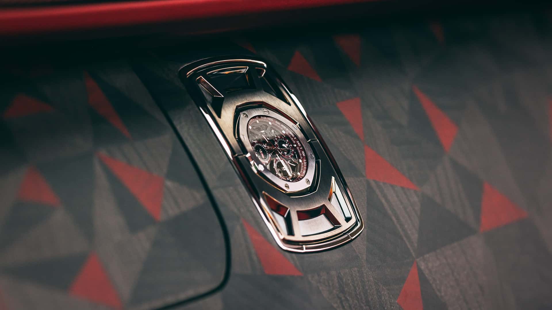 Al centro della plancia della Rolls-Royce La Rose Noire Droptail troviamo un orologio Audemars Piguet Royal Oak concept da 43 millimetri; un cronografo GMT Large Date che si abbina ai colori de La Rose Noire, incorporando contatori rossi e una lunetta interna, a sua volta rossa, a contrastare con il quadrante nero evidenziato da smussi color rodio. I clienti hanno richiesto che fosse removibile e indossabile. Una volta rimossa, l’apertura nella fascia è coperta da un elegante orologio a testa vuota in titanio che mette in risalto una moneta in oro bianco con un’incisione a forma di rosa. La Rolls-Royce La Rose Noire Droptail è una delle quattro commissioni Droptail uniche che il carrozziere intende costruire.
