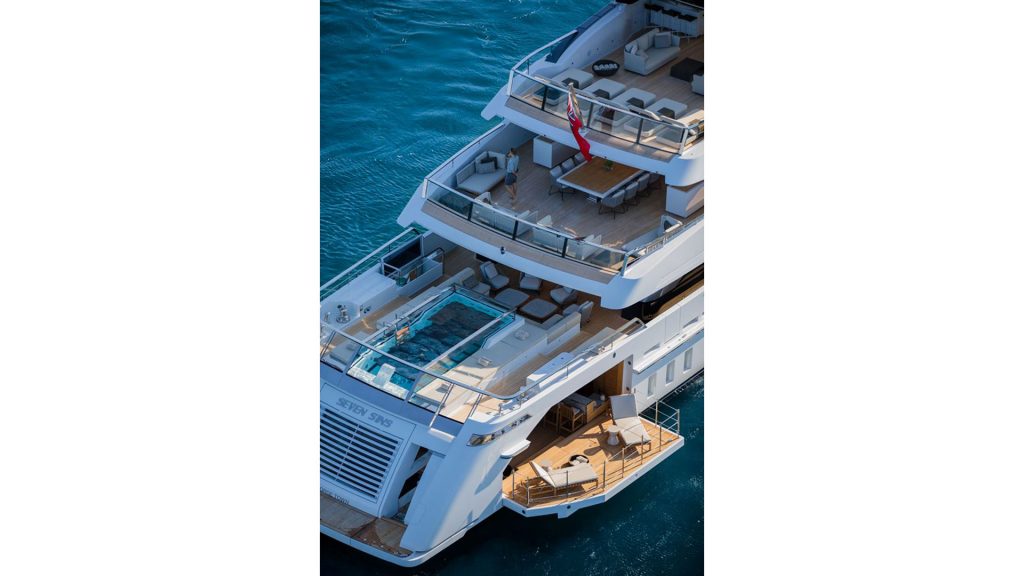 Piscina e box in cui alloggiare il tender completano la dotazione del Sanlorenzo 52steel M/Y Seven Sins, che mette a disposizione al proprio interno due cabine ospiti, altrettante cabine VIP e una Master Suite, oltre naturalmente agli alloggiamenti per l’equipaggio di 10 persone.