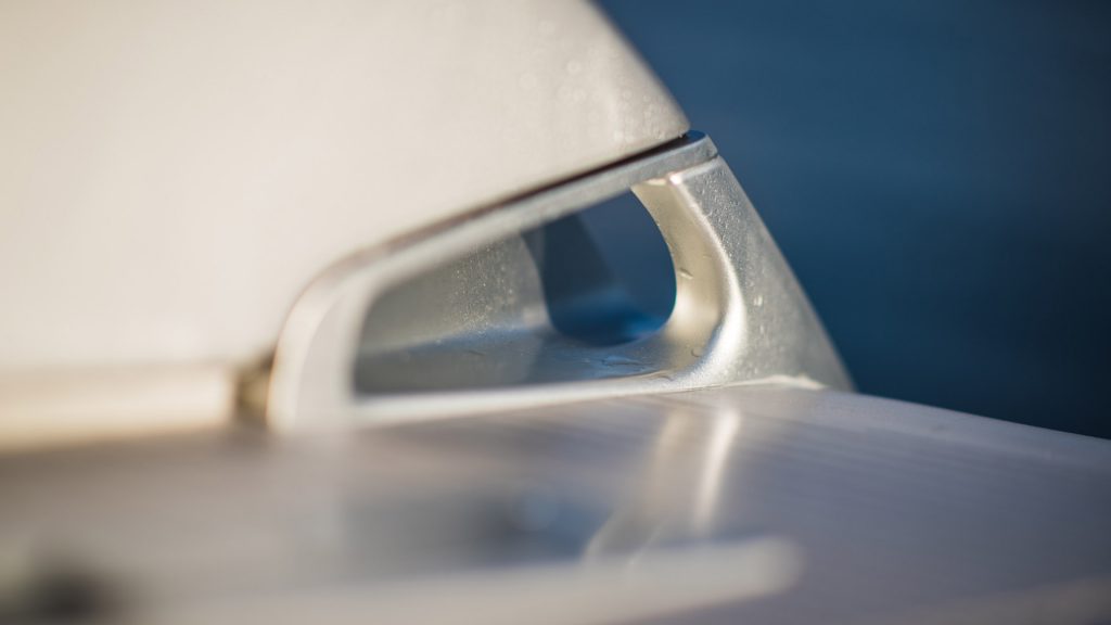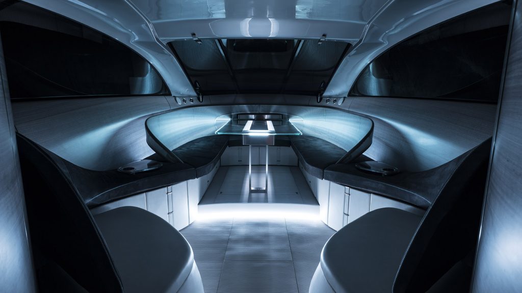 Superfici trasparenti oscurate di ispirazione automobilistica e finestre laterali apribili tramite pressione di un pulsante completano la dotazione del Silver Arrows Marine Arrow460-Granturismo, che accoglie al suo interno sino ad un massimo di 10 persone (consentendone il pernottamento di due), le quali trovano spazio all’interno di un ambiente dominato da materiali pregiati, come i rivestimenti in pelle nubuck, le tappezzerie in mesh e una pavimentazione caratterizzata da soluzioni costruttive molto ricercate.