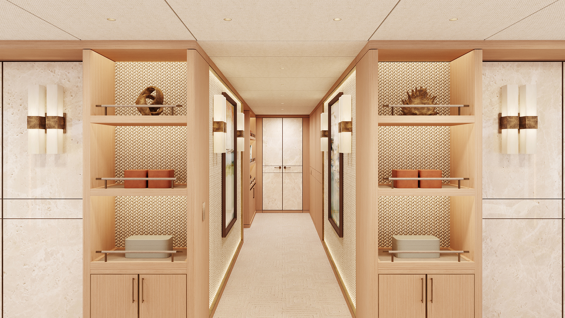 Dedicato interamente all’armatore, il ponte superiore vanta una vasta cabina armatoriale con una vista panoramica verso prua, completata dall’accesso a una piscina privata e all’eliporto a prua. Questa suite include un guardaroba walk-in, bagni Lui e Lei e uno studio. Spostandosi verso poppa, ecco il salone panoramico e l’area pranzo all’aperto. Sul ponte di comando, oltre alla timoneria, troviamo la cabina del capitano e una sala cinema per l’intrattenimento degli ospiti. Il sundeck presenta un’altra area lounge all’aperto dotata di bar, lettini prendisole e due divani a forma di L rivolti fronte marcia.
