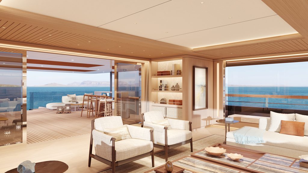 Gli esterni presentano linee bilanciate, moderne e raffinate. Al centro di questo progetto si trova l’area di poppa, che include un beach-club con una sala lounge dotata di palestra convertibile, un’area relax con sauna e sala massaggi e murate laterali abbattibili che si aprono al livello del mare. A quanto elencato si aggiunge una piscina esterna, accompagnata da un’area prendisole completamente personalizzabile secondo le preferenze dell’armatore. Abbattendo le murate laterali si espande ulteriormente lo spazio del beach-club, trasformandolo in una lounge privata sul mare.