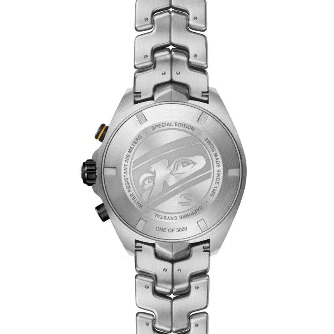 Il secondo (referenza: CAZ101AX.BA0637) è alimentato da un movimento cronografo al quarzo, è impermeabile fino a 200 metri di profondità e presenta una cassa in acciaio satinata e lucidata da 43 mm di diametro, nonché una corona a vite in acciaio con rivestimento in DLC nero. Il quadrante è spazzolato con effetto soleil e anche questo mette alla vista il datario – stavolta posizionato alle ore 4 – e grafiche e loghi del campione brasiliano. Immancabile anche qui il riferimento al casco del driver. Il cinturino in questo caso è in acciaio (in color argento) satinato e presenta una fibbia pieghevole lucida in acciaio. State pensando di aggiungerlo in collezione? L’importo è di 2.650 euro. Anche in questo caso il fondello presenta l’incisione con l’effige di Ayrton con indosso il casco.
