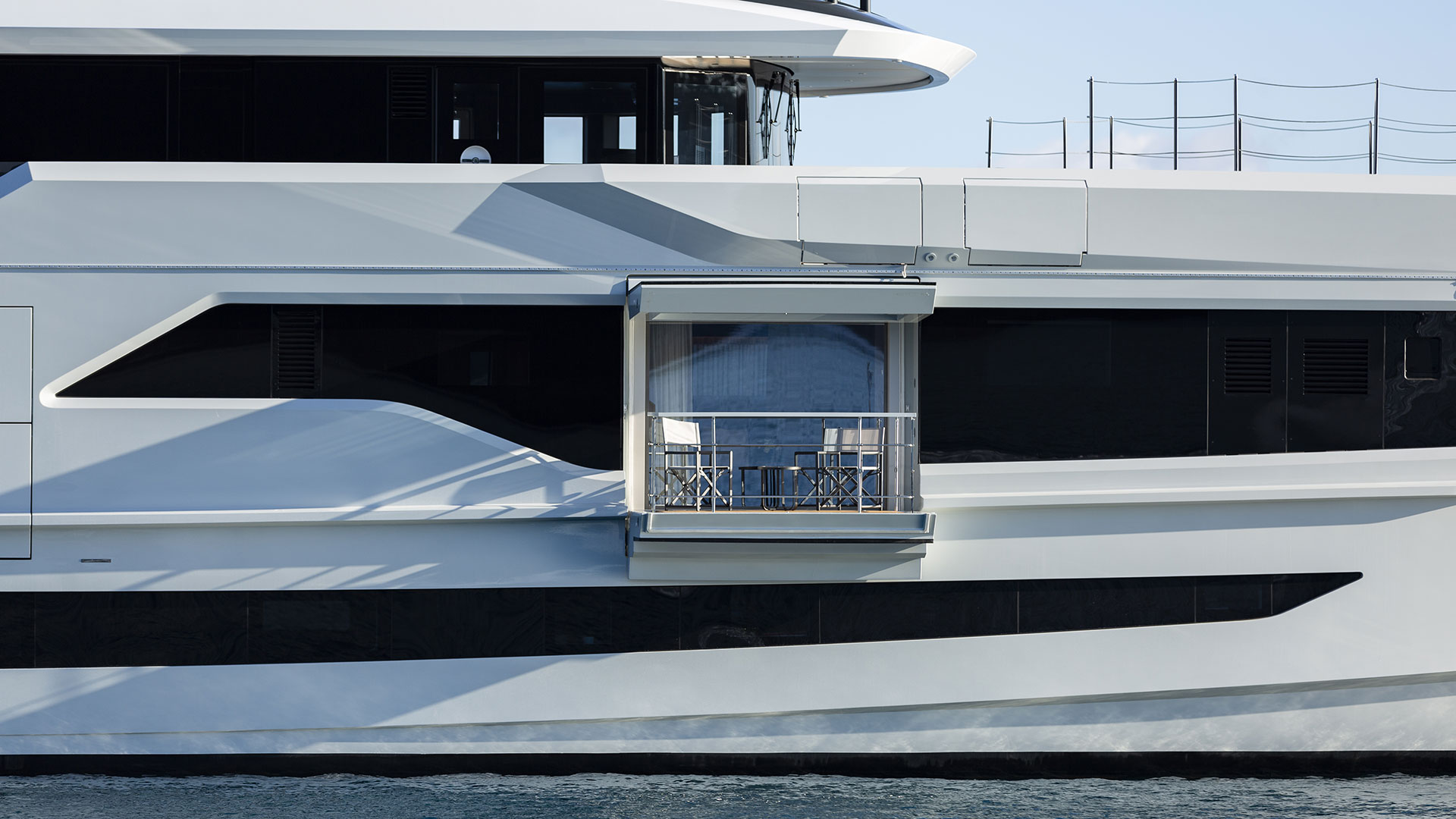 Per la progettazione di questo yacht non si è partiti da un foglio bianco, ma da un’evoluzione dei gusti e delle aspirazioni di un armatore già cliente affezionato del cantiere. Francesco Paszkowski, con la collaborazione di Margherita Casprini per gli interni, ha guidato l’intero progetto. Diamond Binta riprende alcuni elementi distintivi degli yacht moderni – come il beach club a poppa, la palestra panoramica sul ponte superiore, la suite armatoriale sul ponte principale, il garage per un tender limousine di 9 metri e l’eliporto sul ponte superiore – reinterpretandoli. Il beach club include un’area relax con salotto e un’area spa con parete in vetro, che lascia filtrare la luce naturale quando le terrazze laterali sono abbassate e la porta del portellone è aperta. Inoltre, un lucernario dal ponte principale illumina ulteriormente quest’area. Sul ponte inferiore troviamo un corridoio centrale per gli ospiti, con ampie vetrate panoramiche che si affacciano su una originale sala macchine a vista, e che collega direttamente il beach club con le cabine ospiti. A bordo possono essere accolti fino a 12 ospiti in cinque cabine, incluse due con letti pullman. La suite armatoriale a tutto baglio, situata a prua del ponte principale, include un’area lounge e uno studio con terrazza abbattibile. Qui si possono notare dettagli di design unici, come i motivi asimmetrici nei tappeti e nei cielini, e la cura nei particolari dell’arredamento e delle finiture.