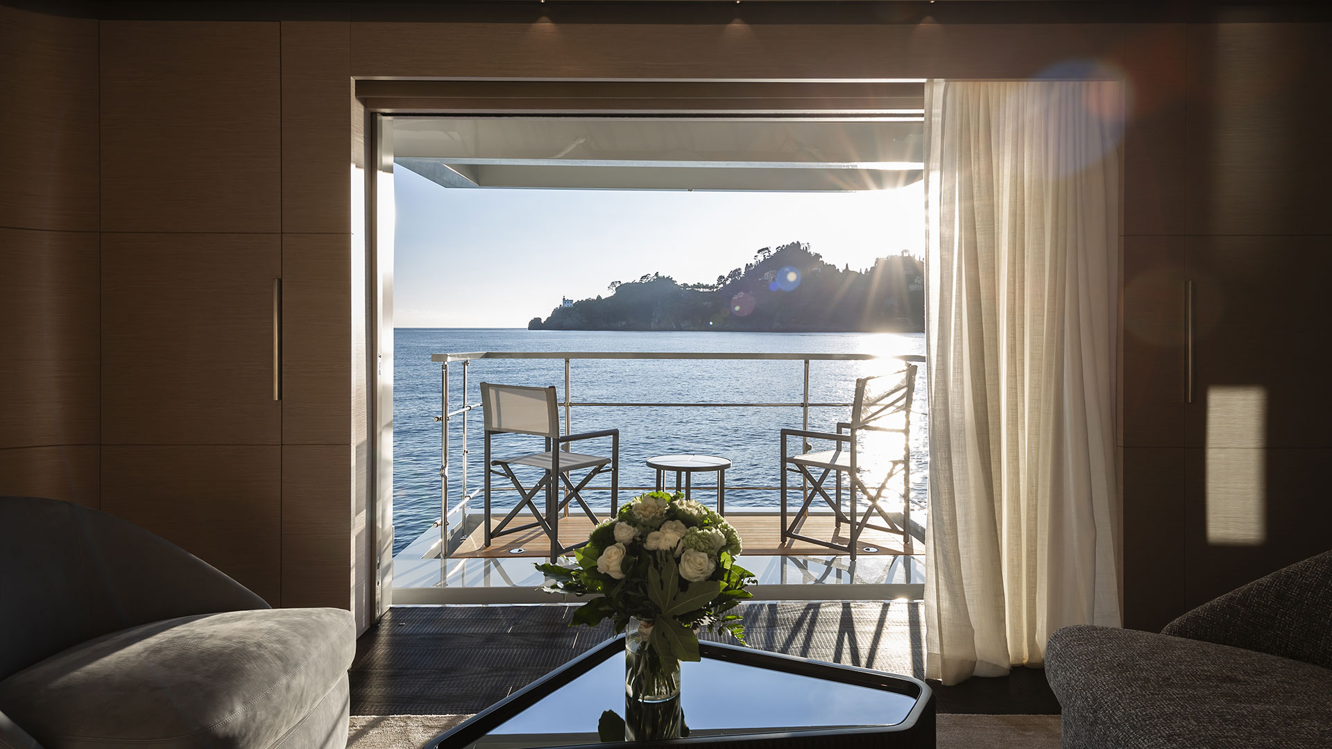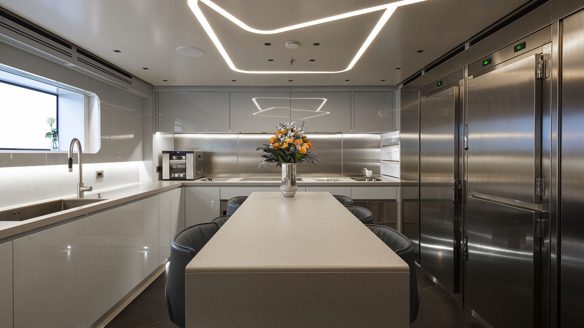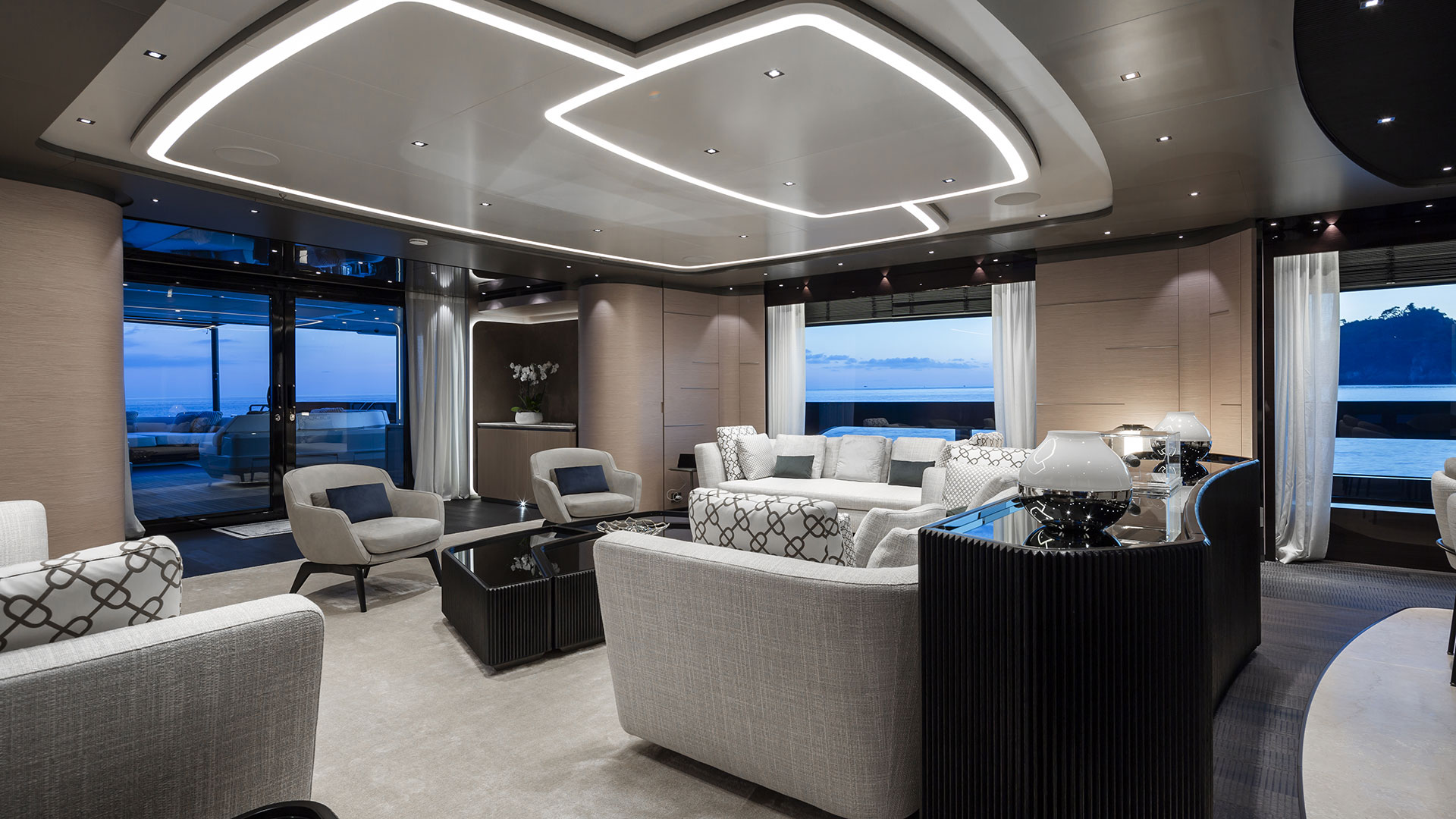 Quasi tutti gli arredi a bordo sono stati progettati su misura, tra cui i tavolini delle zone living, la suite armatoriale, il beach club lounge, la scrivania dell’ufficio dell’armatore e il bancone della cucina. Questi elementi si integrano con mobili firmati da marchi rinomati, come divani, poltrone, tavoli da pranzo e sedie Minotti, che arredano le aree living dei ponti principale e superiore, oltre alla suite armatoriale. Gli sgabelli Poltrona Frau aggiungono un tocco di raffinatezza alla cucina, che svolge un duplice ruolo: come area operativa per l’equipaggio e come spazio dedicato all’armatore e ai suoi ospiti. Gli interni riflettono l’approccio boutique. Linee morbide e arrotondate prendono il posto delle classiche forme geometriche. Anche gli elementi funzionali sono stati reinterpretati: i tavolini, ad esempio, uniscono più pezzi separati in un insieme armonioso. I mobili bassi, caratterizzati da angoli smussati, sono rifiniti con listelli in rovere laccato nero, mentre le pareti in rovere grigio chiaro dell’ufficio armatoriale si curvano, formando partizioni simili a scenografie che definiscono gli spazi. Divani e poltrone dalle forme arrotondate si integrano con i tappeti circolari posizionati sotto di essi.