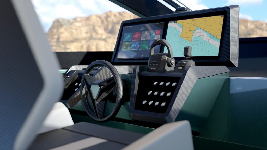 Il pozzetto rialzato, posizionato a proravia dei lettini prendisole, è protetto dall’hardtop e permette di entrare a contatto con l’ambiente circostante. Un tavolo da pranzo con panche e ulteriori sedute può accogliere otto persone, con spazio per altri ospiti sui sedili fronte marcia e sulle poltrone della timoneria. Naturalmente, c’è anche un prendisole a prua con poggiatesta regolabili, ideale per abbronzarsi all’ancora o lontano da occhi indiscreti quando si è ormeggiati di poppa; l’accesso al sistema di ancoraggio nascosto permette di avere il ponte di prua totalmente privo di ostacoli. La timoneria è moderna, con due grandi schermi MFD che forniscono l’accesso ai dati operativi e di sistema, oltre a una suite navcomms completa. Sottocoperta troviamo un bagno completo con doccia separata, un letto matrimoniale a prua, un’area salotto e la kitchenette.